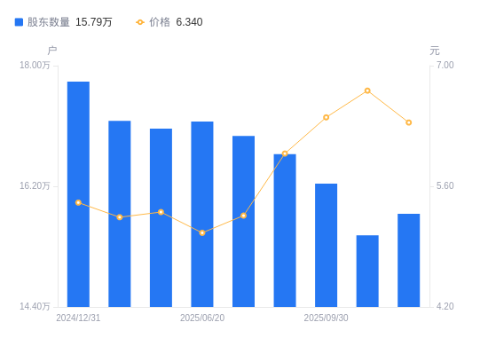 日期A股户数(户)流通A股户均持股数(股)户均持股市值(万元)2025-11-3015790031921.3520.242025-10-3115470032581.6521.862025-09-3016240431036.0619.862025-09-2016680030218.1118.072025-06-3016950730035.8815.802025-06-2017167629656.4015.012025-03-3117059829843.7915.822025-02-2817176729640.6915.532024-12-3117761828664.2815.512024-09-3016211331405.8217.50