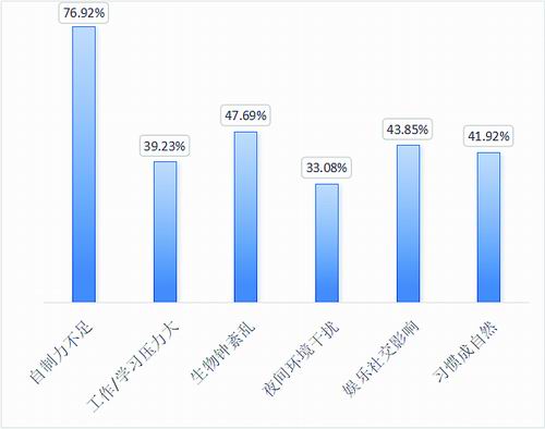 在调整作息失败的原因中,自制力不足高居首位,充分展现出智能手机已成为大学生熬夜的“第一推手”。