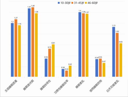 18岁至30岁这一年龄段可大致对应年轻人群。数据显示,与其他年龄段相比,该群体的睡眠紊乱和日间功能紊乱得分均值最高,睡眠持续性得分均值则最低。尽管其他部分指标在3个年龄段中并未处于最差水平,但习惯性熬夜对年轻人睡眠质量与日常功能的影响依然值得高度重视。