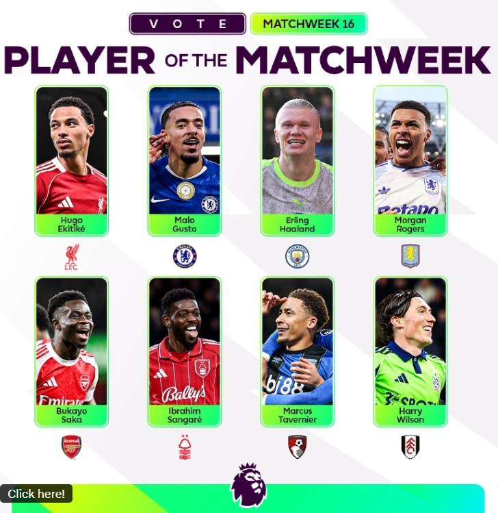 直播吧12月16日讯英超官方公布了本轮最佳球员候选名单,其中埃基蒂克、萨卡、哈兰德等球员在列,具体如下: