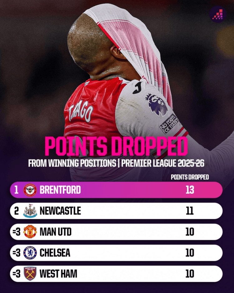 13分!布伦特福德是本赛季领先后丢掉积分最多的英超球队