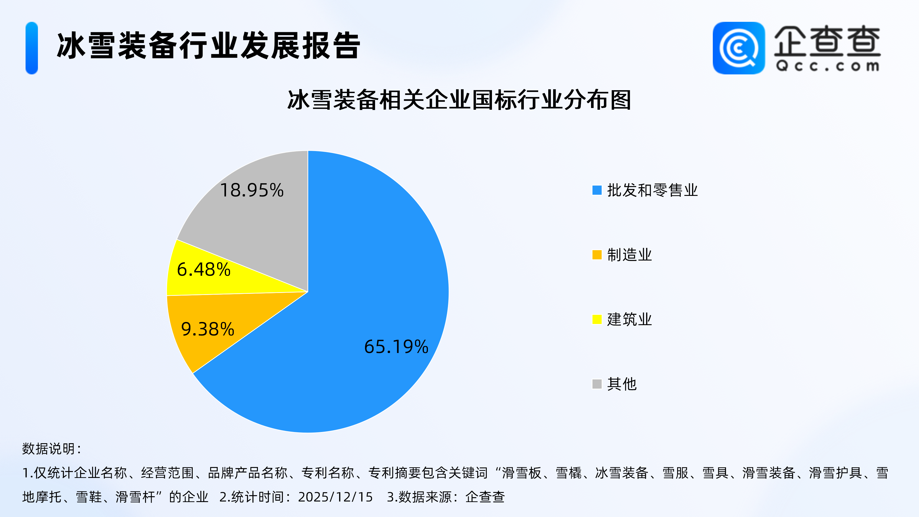 企查查数据显示,从国标行业归属分布来看,冰雪装备相关企业多归属于批发和零售业,占比65.19%。其次,归属于制造业、建筑业的冰雪装备相关企业分别占比9.38%、6.48%。