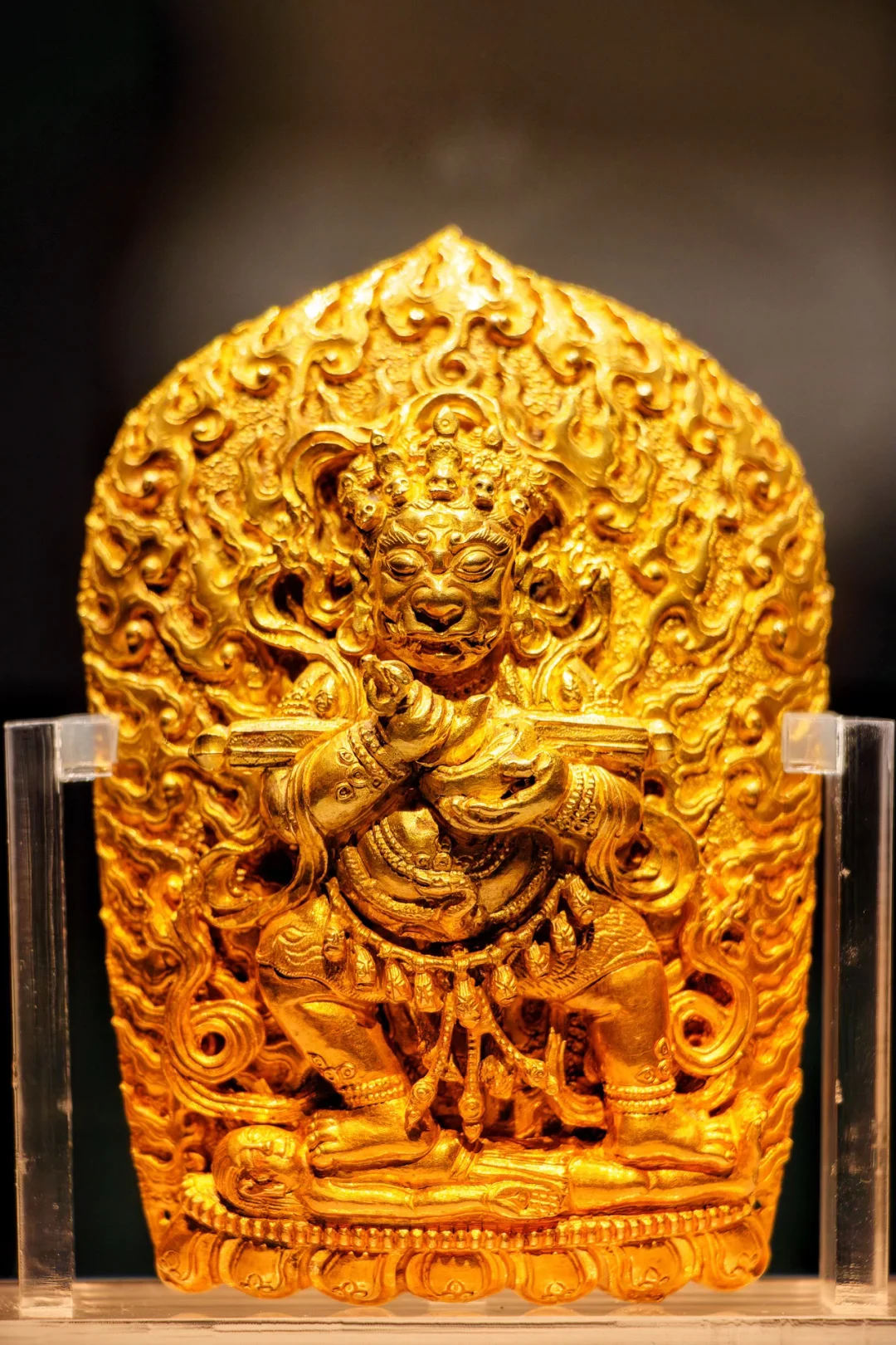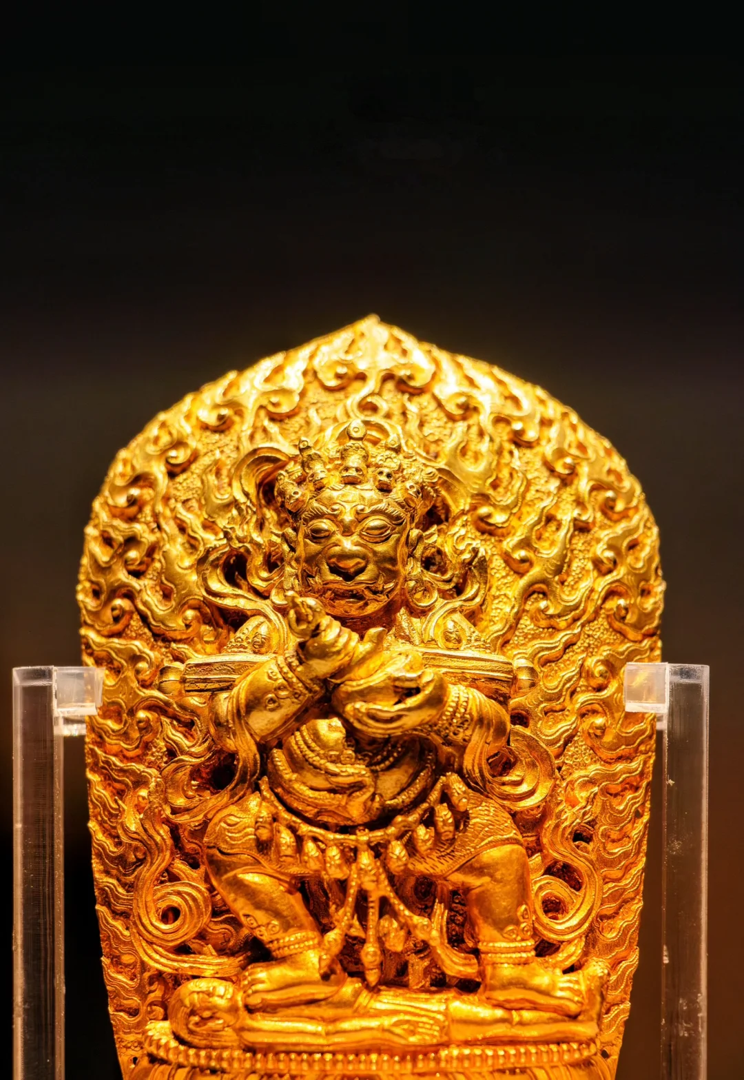 📝神像正面浮塑大黑天舞姿像,下设莲座,背面满饰火焰纹,背光呈圭形。大黑天作赤足 “左展立” 姿,头戴五骷髅宝冠,面相长圆凶恶,三目圆睁,双眉上扬,大鼻巨嘴,两颗獠齿上出,垂耳及肩,双耳悬蛇。肩佩飘带,颈系骷髅璎珞,着短裙,双手曲肘向前,肘间兜搂一 “棒” 横置于胸前,左掌斜托一 “颅器”,右掌斜握一件四股金刚杵柄的 “钺刀”,腰缠二蛇,手、足腕各套有蛇做的钏镯,双跣足,足掌朝外,踏在一个仰面平躺的 “地神女天” 身上,“地神女天” 躺在七瓣的覆莲座上。