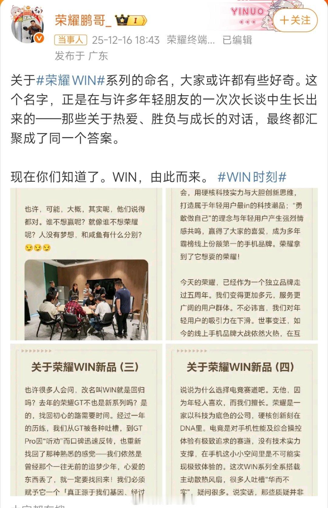 荣耀GT系列升级为荣耀WIN 荣耀今日宣布,全新WIN系列正式接管性能战场。该系列定位“超神性能双旗舰”,至于为啥叫WIN,看完鹏哥说的WIN系列命名由来,瞬间觉得这个系列的定位更清晰了。