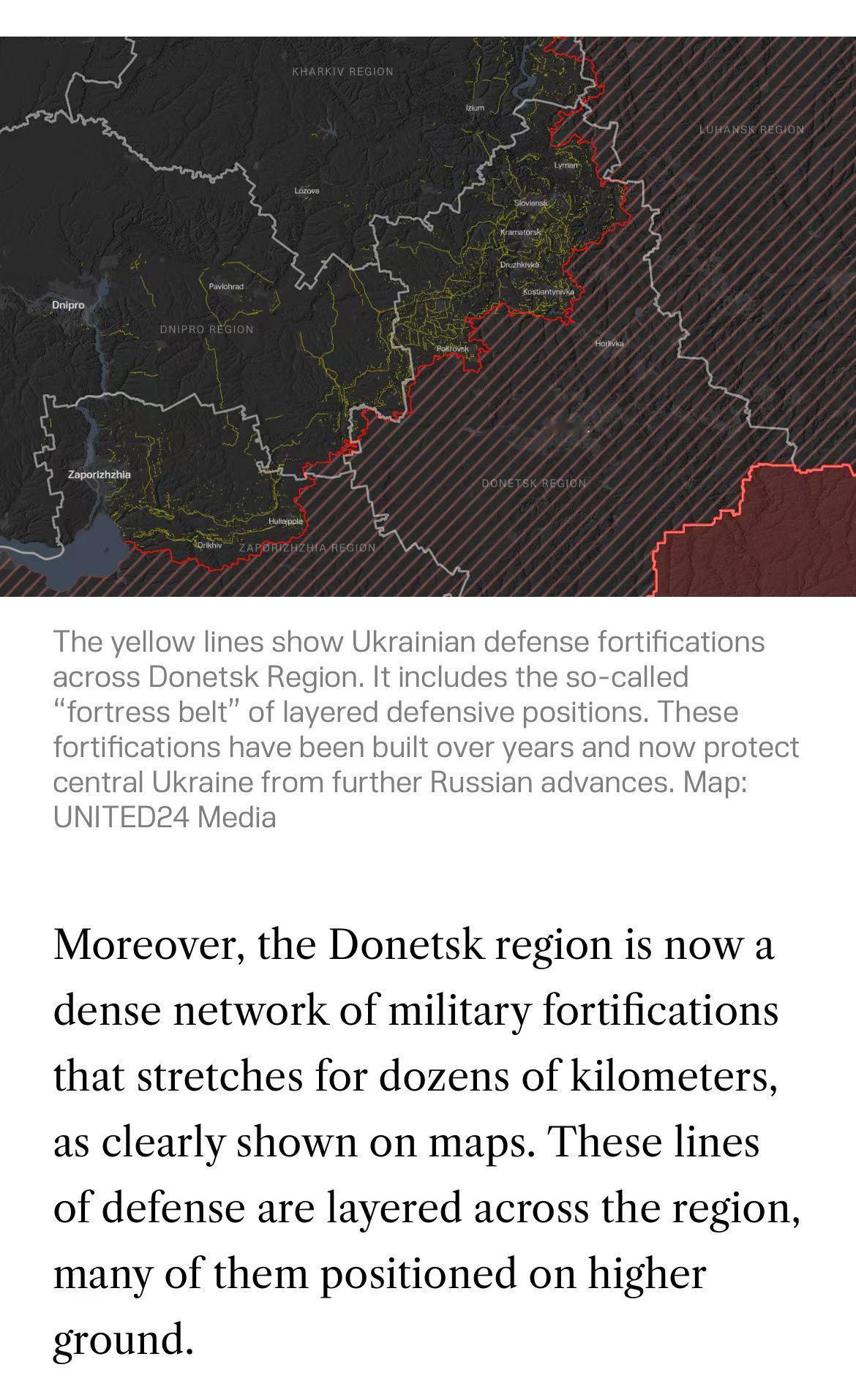 乌克兰和平谈判仍然没有解决的关键问题——顿涅斯克地区。泽连斯基表示,俄罗斯仍然要求得到全部顿涅斯克,但乌克兰军队不会从顿涅斯克撤军。为什么俄罗斯必须要得到顿涅斯克而乌克兰坚决不放弃呢?俄罗斯的动机很明确:乌克兰在该地区防御非常强大,将主要城市变成了巨大的防御屏障。通过武力占领这些地区将使俄罗斯损失数十万人的生命和数百亿美元。目前,顿涅茨克地区约三分之一的地区仍处于乌克兰武装部队的控制之下,包括Kramatorsk 、Sloviansk、Kostiantynivka、Druzhkivka和Pokrovsk等城市——这些城市构成了乌克兰坚固的防线阵线,被称为乌克兰的“堡垒地带”。占领它们需要巨大的资源和漫长的时间,可能需要数年的残酷争夺。以查西夫亚尔小镇为例,夺取这个小小的村镇俄罗斯耗时20个月。