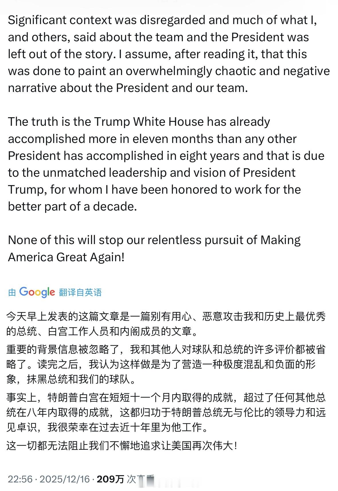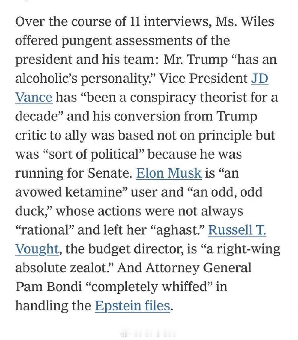 《名利场》杂志作者爆出特朗普幕僚长苏西威尔斯的谈话细节,威尔斯表示特朗普在爱泼斯坦档案名单威尔斯女士对总统及其团队给出了尖锐的评价:特朗普“有着酒鬼的性格”;JD·万斯“十年来一直是阴谋论者”,他从特朗普的批评者转变为盟友并非基于原则,而是“有点政治因素”,因为他当时在竞选参议员;埃隆·马斯克“公开承认自己是氯胺酮使用者”,而且“是个怪人,其行为并非总是理性,让她感到震惊”;预算主管拉塞尔·T·沃特“是个极端的右翼狂热分子”;而司法部长帕姆·邦迪在处理爱泼斯坦案的文件时“完全搞砸了”苏西威尔斯迅速发文反驳,表示这篇文章的重要背景信息被忽略了(图五)热点现场热点优质创作计划