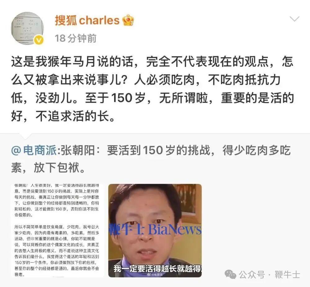 今年8月,张朝阳曾转发一篇博文,此博文提到张朝阳早年“要活到150岁的挑战,得少吃肉多吃素”的言论。