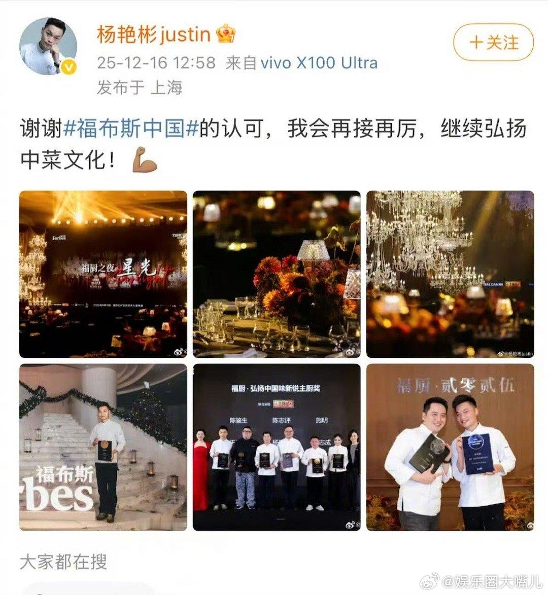 让谢霆锋哭笑不得的男人拿奖了 杨艳彬太给“心机彬”长脸了!《一饭封神》里靠巧思征服谢霆锋,如今福布斯双奖到手,既是福厨30一员,又是弘扬中国味新锐主厨,这厨艺天花板实锤~