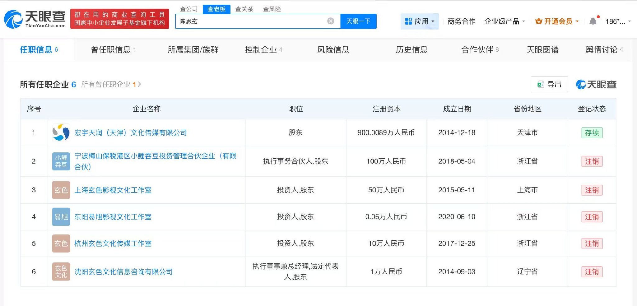 天眼查App显示,陈思玄(玄色)名下关联6家企业,仅宏宇天润(天津)文化传媒有限公司1家为存续状态,涉及文化传媒、投资等领域,陈思玄(玄色)在上述企业担任执行事务合伙人等职务。