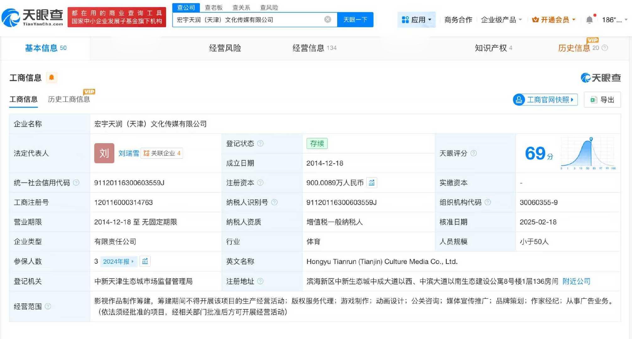 宏宇天润(天津)文化传媒有限公司成立于2014年12月,法定代表人为刘瑞雪,注册资本约900万人民币,经营范围包括版权服务代理、媒体宣传推广、作家经纪等。股东信息显示,该公司由刘瑞雪、陈万宁、陈思玄等共同持股。变更记录显示,今年2月,该公司注册资本由约1111万人民币减至约900万人民币。