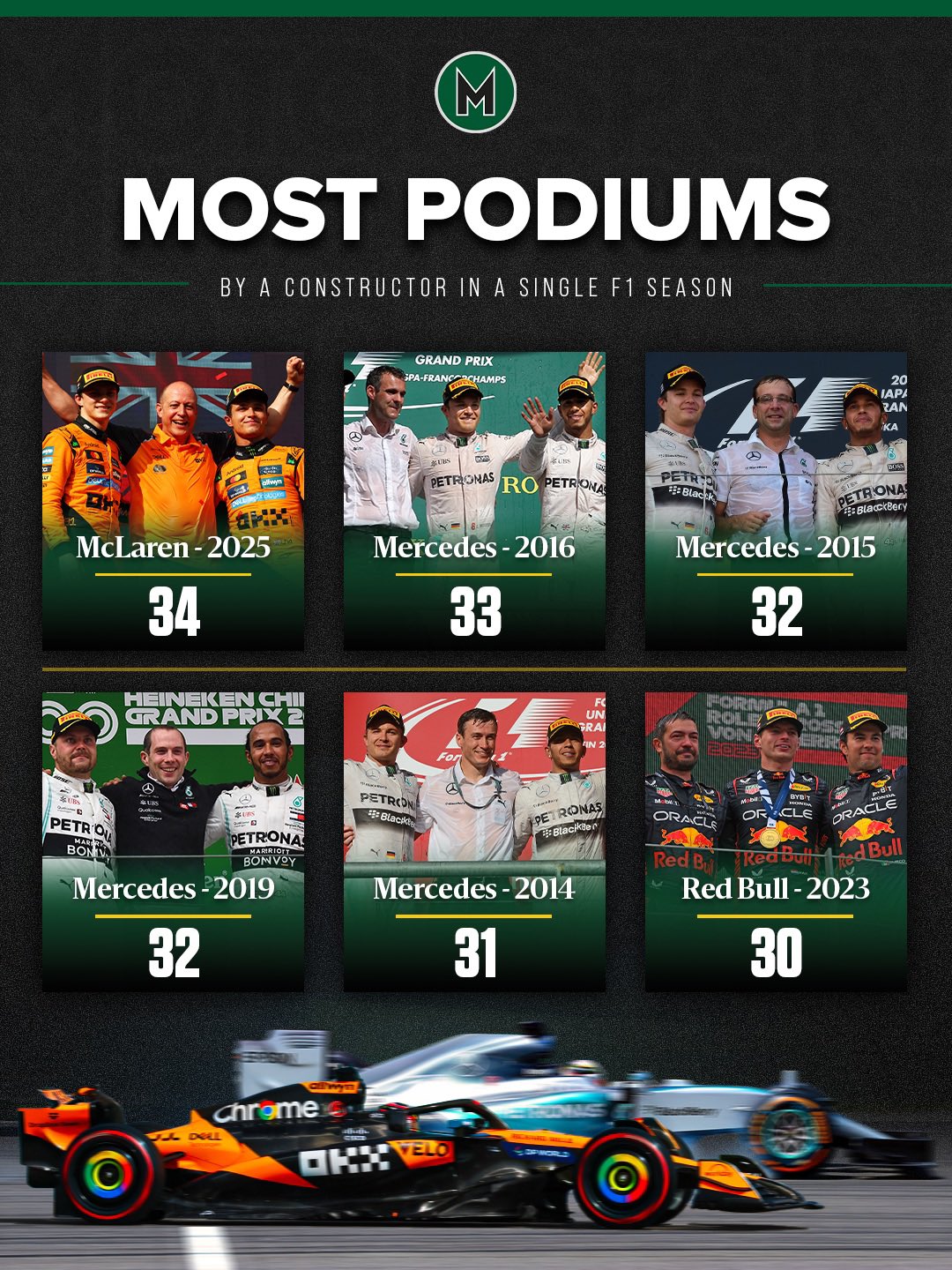 虎扑12月17日讯据赛车运动杂志消息,2025年,迈凯伦车队的兰多-诺里斯和奥斯卡-皮亚斯特里组合共34次登上大奖赛的领奖台位置,这使得迈凯伦在单赛季获得的领奖台次数超过了F1系列赛历史上任何一支其他车队。