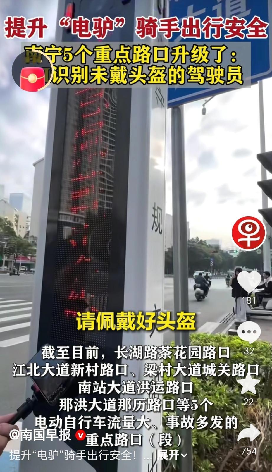 近日南宁为提升电动自行车(“电驴”)骑手出行安全,对5个重点路口进行的交通设施升级。蓝色防滑警示路面,应用智能安全引导系统。还部署AI设备,可自动识别未佩戴头盔的非机动车驾驶员,并通过语音提醒其佩戴头盔。此次升级的路段有长湖路茶花园路口、江北大道新村路口、梁村大道城关路口、南站大道洪运路口、那洪大道那万路口这5个电动自行车流量大、事故多发的重点路口(段)。(来源于@南国早报 )