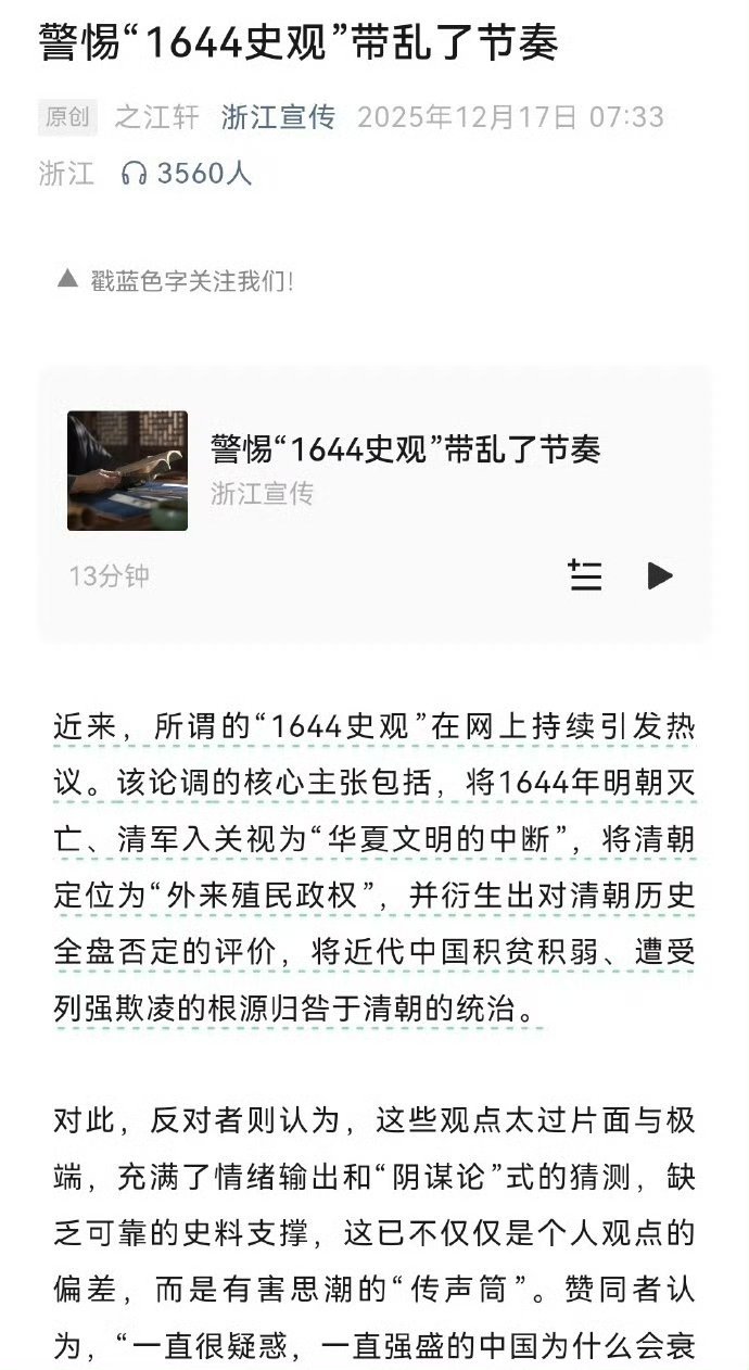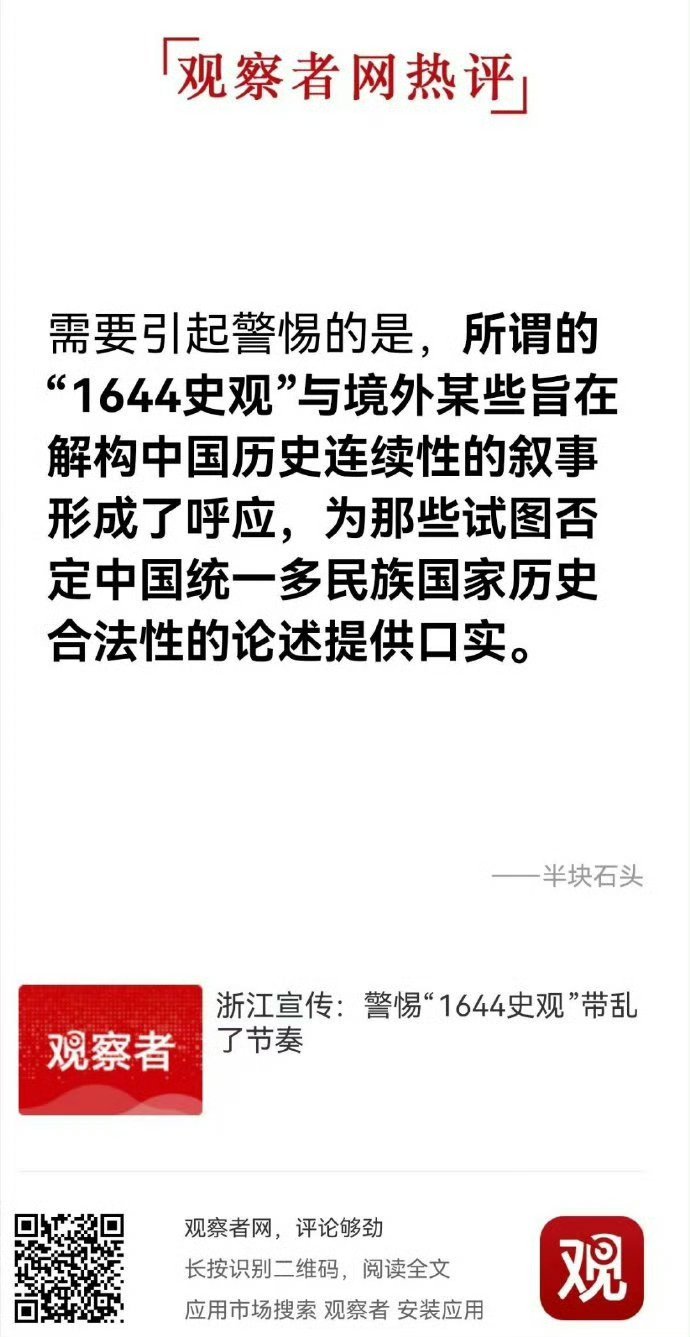 浙江宣传和新华社都发表了评论,其实还是要回到教员所说的阶级史观上来 。警惕1644史观带乱了节奏