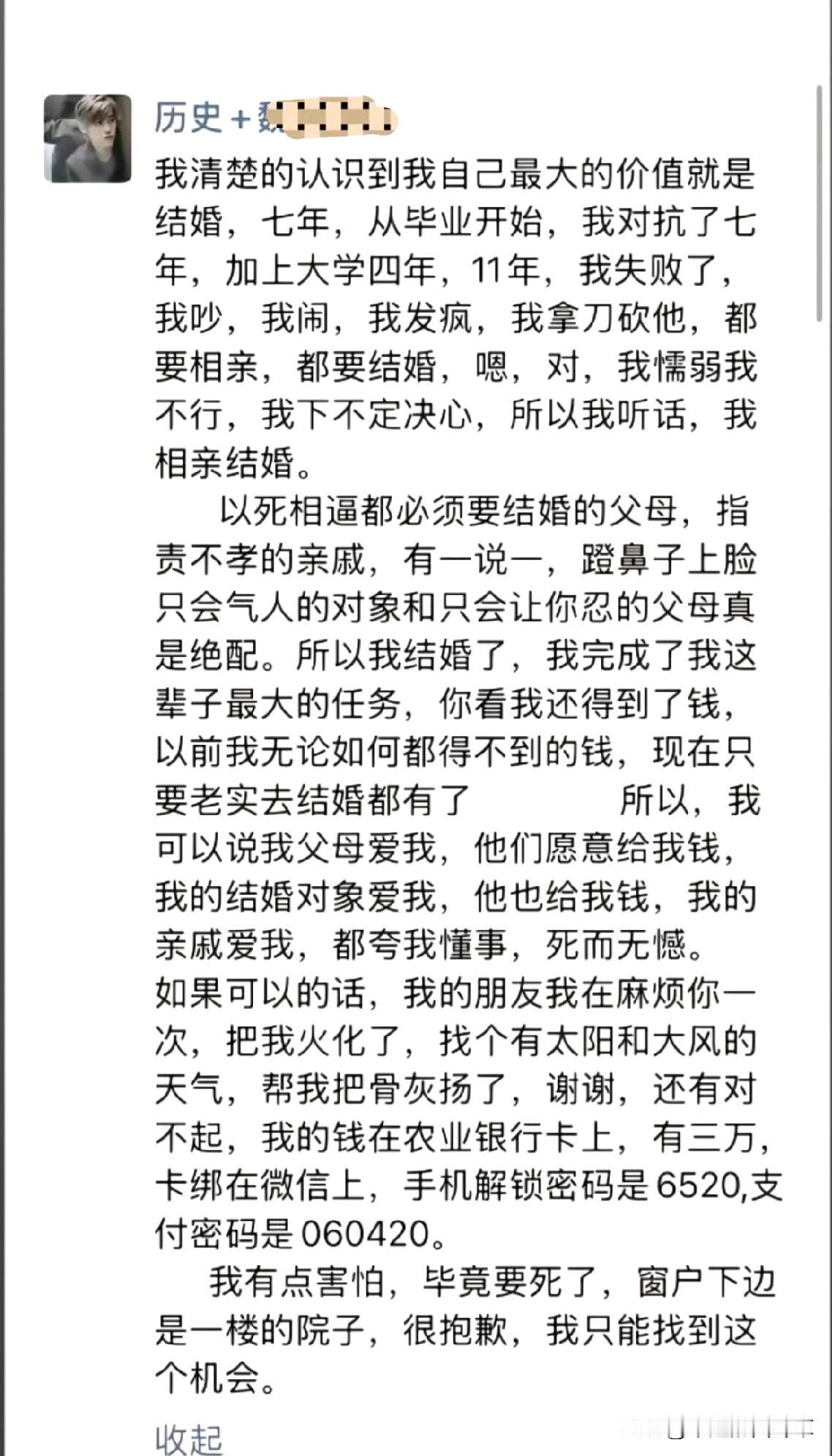 28岁女教师新婚当天坠楼身亡,她留在朋友圈的遗言,读来让人心疼。 这位名叫魏亚蕊的姑娘是河南鲁山一高的在编历史教师,2022年她以笔试第一的成绩考入这所省重点高中,学生和同事都很喜欢她。可谁也没料到,本该是人生大喜的婚礼日,却成了她生命的终点,她从婆家7楼的飘窗一跃而下,结束了自己的生命。 她在遗言里写得清清楚楚,从大学到毕业,她和父母的催婚对抗了整整11年,吵过闹过甚至拿刀反抗过,最后还是被父母以死相逼,不得不妥协去相亲。她跟父母吐槽新郎只会气人,诉说委屈时只得到“忍一忍”的回应,就连手里那3万存款,也都是答应结婚后才拿到的。 遗言里她还细致交代了身后事,想让朋友找个有太阳和大风的天气把骨灰扬了,还特意为惊扰到一楼住户道歉。可这份刻进骨子里的善良,换来的却是坠亡当日的彻骨冷漠——女方家人觉得她已嫁出去,一楼住户的赔偿该由新郎负责,新郎却认为还没正式娶到她,责任该由女方承担,双方互相推诿,连她的遗体都没人愿意认领。 婚礼前一天她就提过要取消婚礼,可父母因为不愿退还彩礼,坚决反对了她的想法。在父母眼里,她似乎不是需要被疼爱的女儿,只是完成结婚任务的工具,是能换来彩礼的筹码,这样的“爱”,到底是真的爱,还是以爱为名的控制与利益考量?