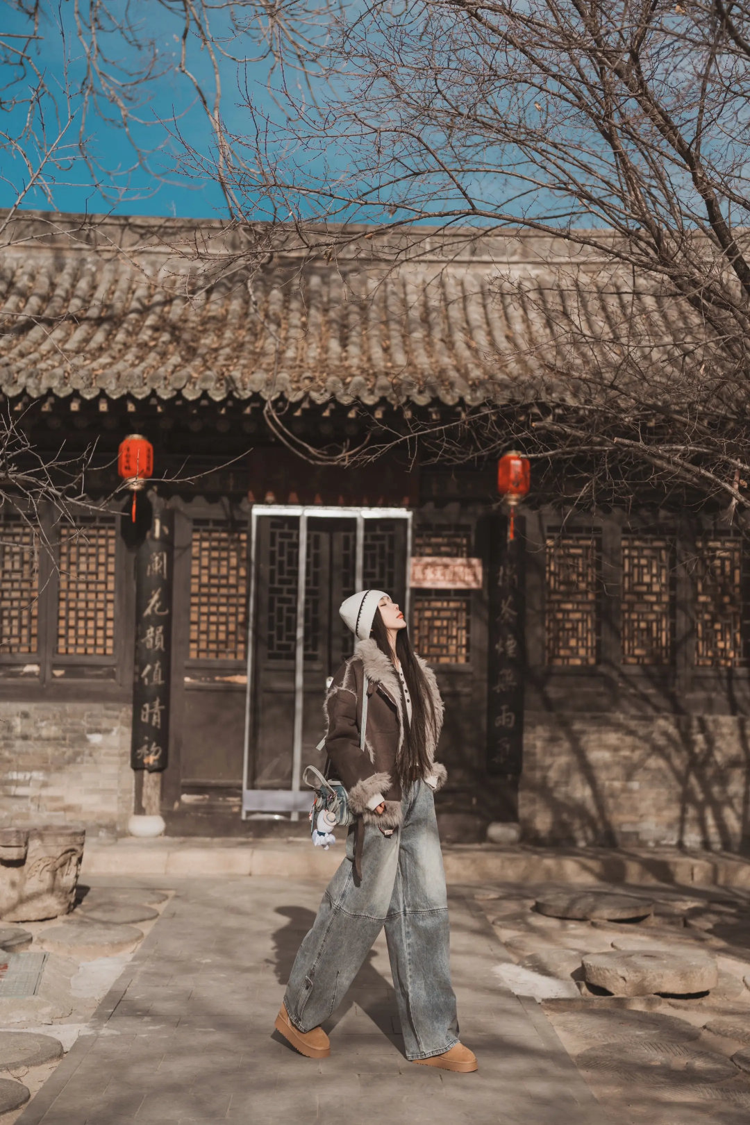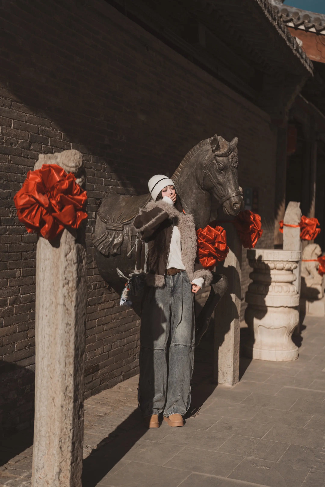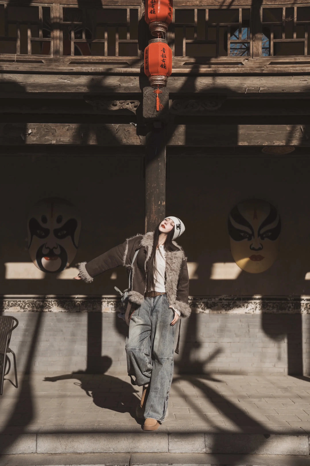 在古镇的阳光下,抱着可爱的小羊,感受生活的美好。