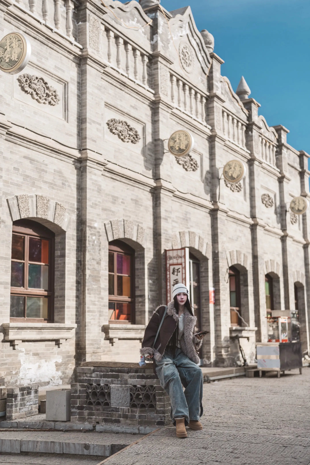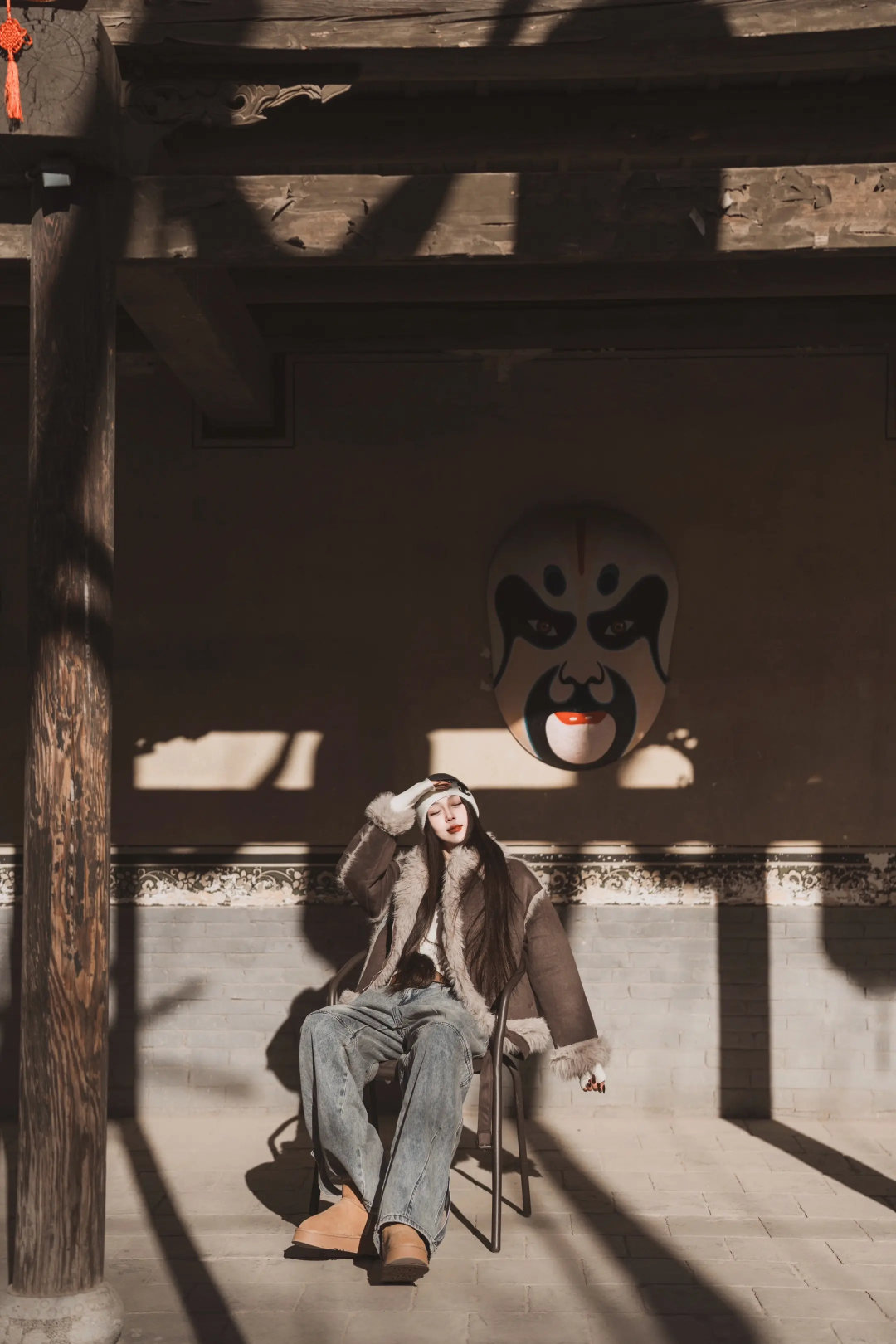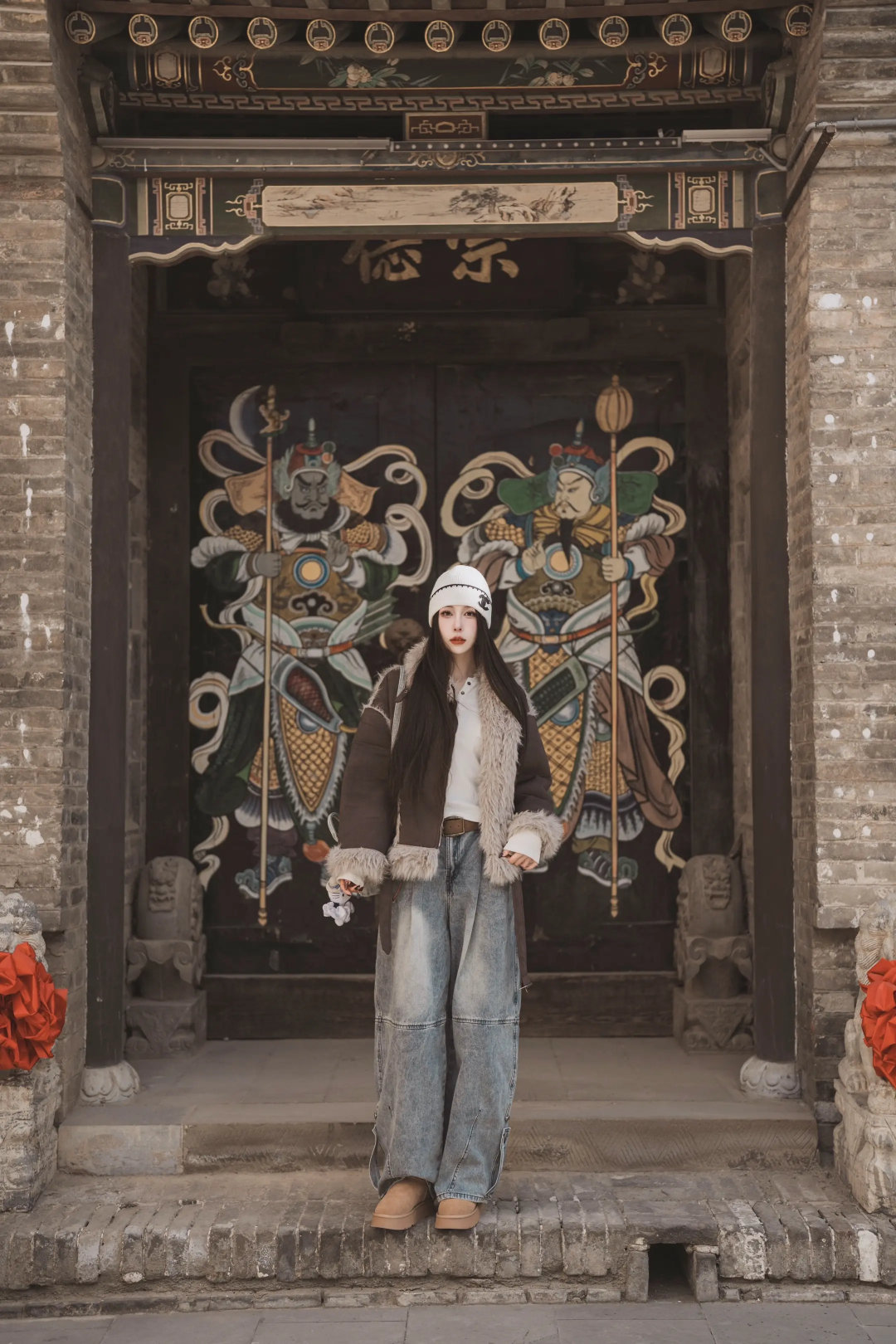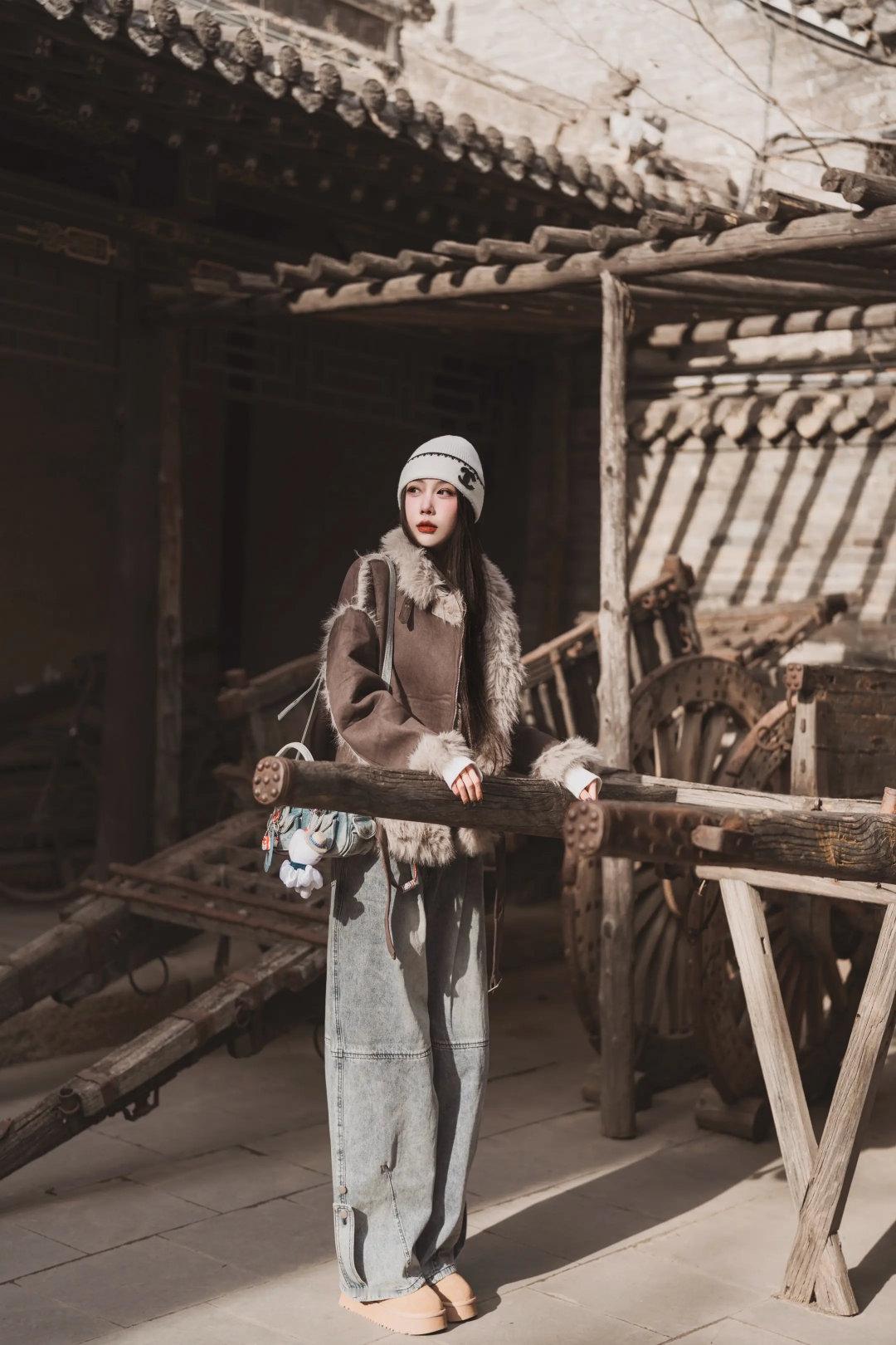 在古镇的阳光下,抱着可爱的小羊,感受生活的美好。