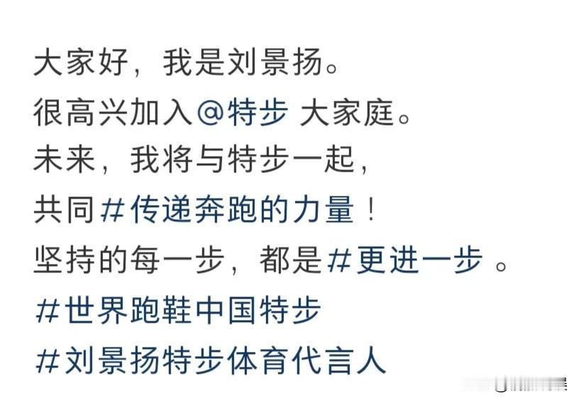 终于等到她的好消息啦,恭喜啊! 全运会女子一百米栏冠军刘景扬,发文加入“特步”大家庭。 特步的眼光咋那么好,刘景扬个子高挑,面相很善,虽说不是很惊艳的那种,但是整体感觉了很潮、很酷,对于各种潮牌,运动品牌的代言,太适合不过了。 这是一个跑起来像风一样的女子,也是在荆棘中开出花的女子。 别的不说,就她那种低调,不张扬,胜不骄败不馁,埋头苦干的精神,就赢得很多人的喜欢了。 终于等到了她的代言,“特步”好啊,为了支持刘景扬,我要给家里的两个娃都买这个品牌的运动鞋。[呲牙]
