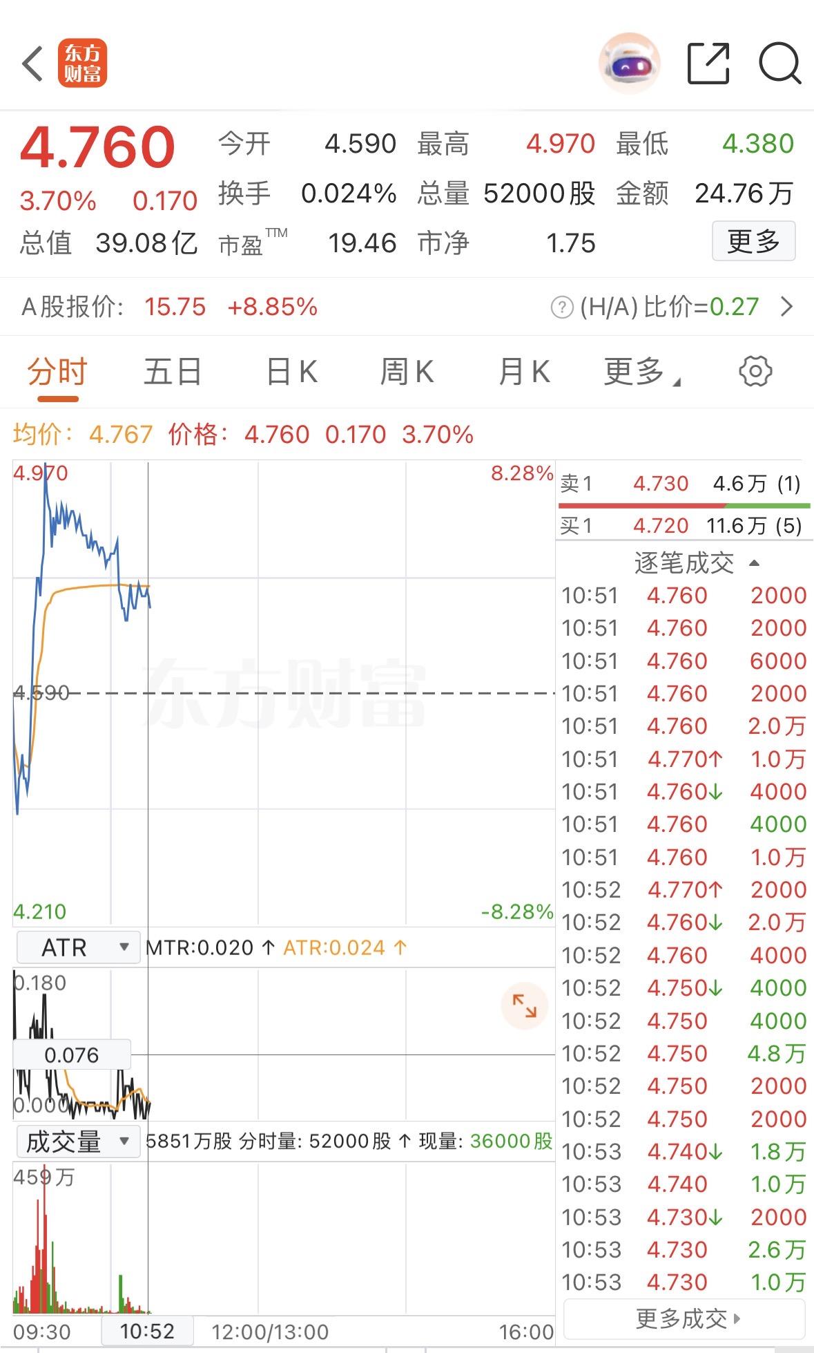 上证报中国证券网讯(林铭溱记者孔令仪)12月18日,港股浙江世宝延续昨日涨势,早盘冲高回落,一度涨超8%,最高报4.97港元/股。截至10时52分,港股浙江世宝涨3.7%,报4.76港元/股。