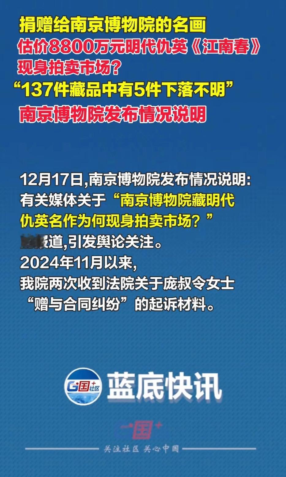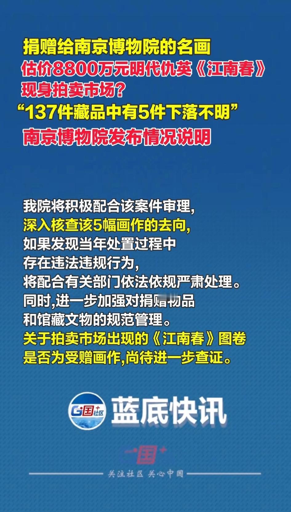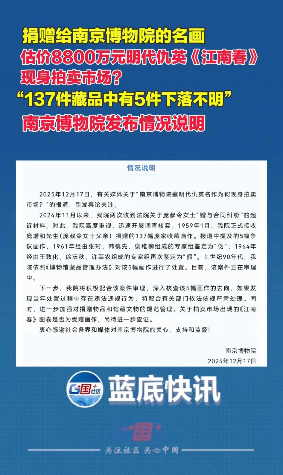 南博回应了!实锤了,捐赠给南博名画,鉴定为“伪”这事儿可太有看头了。 1959 年庞增和把 137 幅庞家收藏画作捐给南博,庞莱臣在收藏界那可是响当当的人物。 可 1961 年和 1964 年,专家组两次鉴定其中 5 幅为“伪”。 上世纪 90 年代,南博按规定对这 5 幅画处置。谁能想到,2025 年 5 月,一幅曾被捐入南博的仇英《江南春》图卷现身拍场,估价 8800 万。 当时既然鉴定为“伪作”为什么不还给捐赠方?既然是假的,最后也应该有明确的去处呀,比如销毁了,也该有个说法呀,就这样不明不白的消失了? 这中间隔了半个多世纪,档案留痕、通知到位与否,都考验着公众对博物馆的信任。 仇英的《江南春》现身拍卖场,估价8800万没有说清楚呀,只说5件消失的名画是假的,那这个8800万的真画怎么会被拍卖?也没讲清楚呀?博物馆不要避重就轻,5件假画在哪里?真画怎么进的拍卖场? 网友们都等着答案呐?目前案件还在审理,就看后续怎么个说法了。