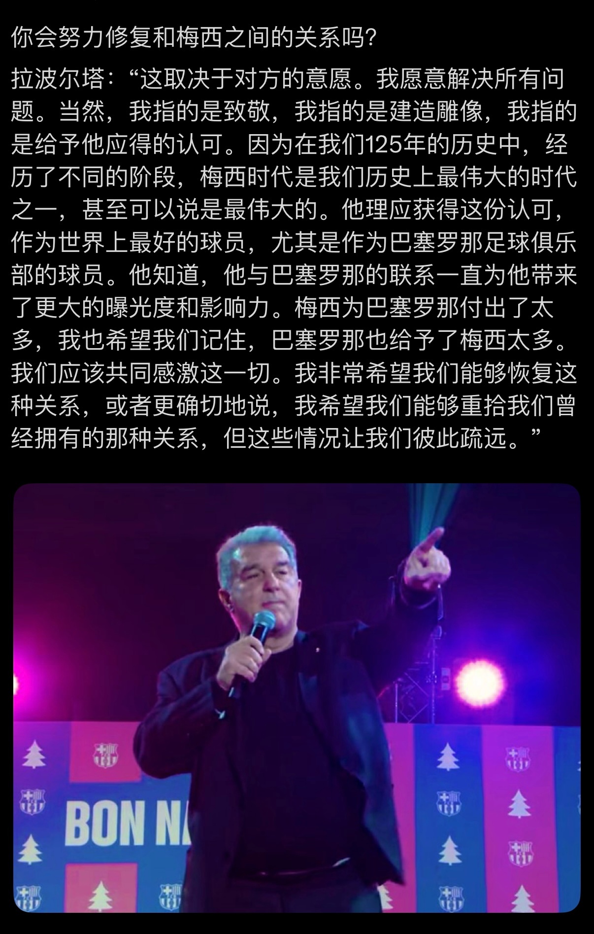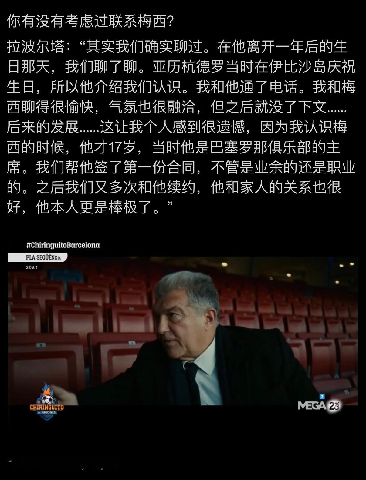 【?????】拉波尔塔:“我不对梅西的离开感到愤怒。” “其实我和梅西聊过,并且很愉快。但后来没了下文我感到很遗憾。” “我希望和梅西修复关系,我愿意给他建造雕塑。”