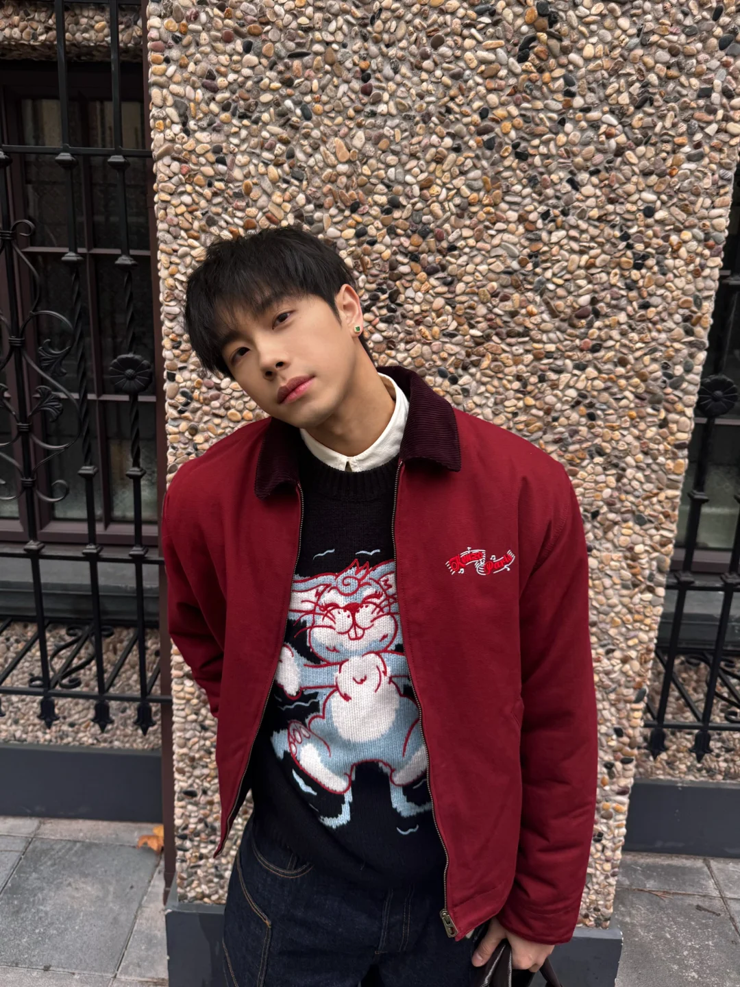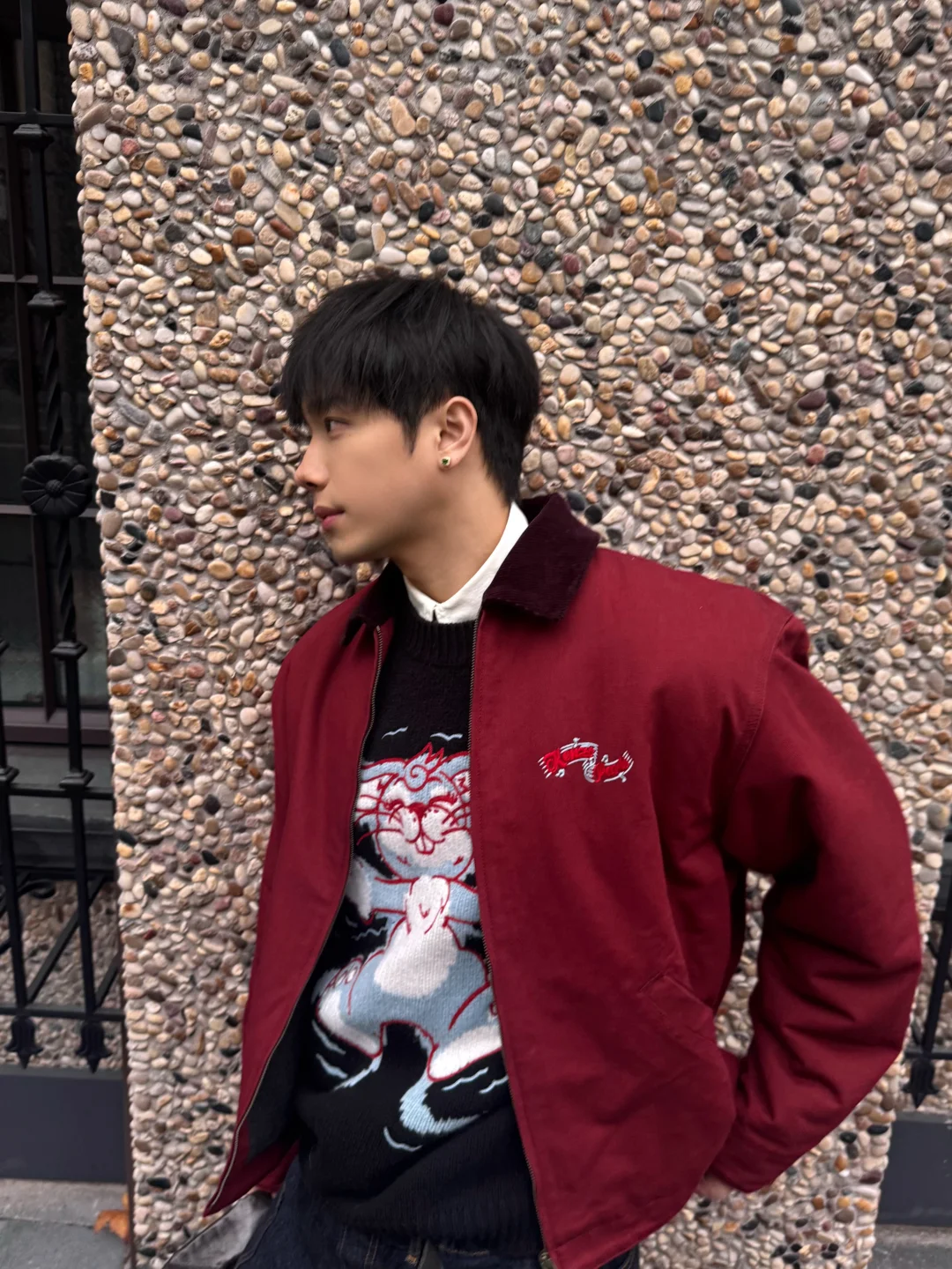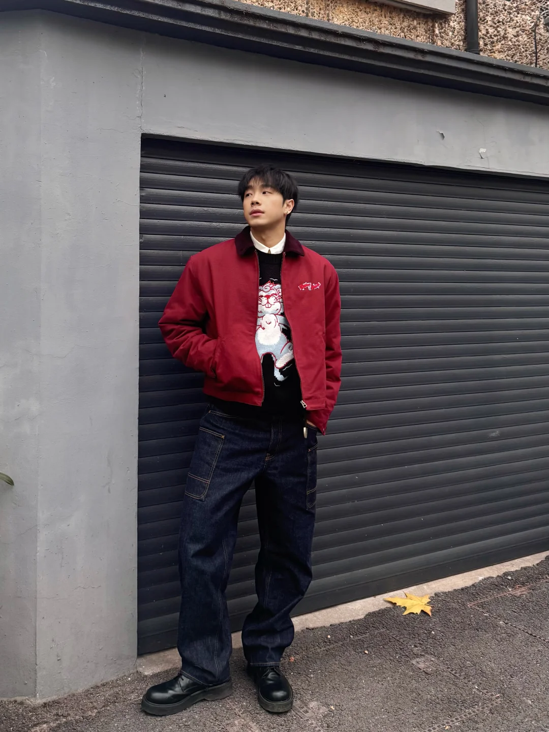 今日的红黑配解锁新ootd 感觉圣诞新年都能用这个公式搭配 (来自假日系列的)酒红色工装夹克叠穿K黑色毛衣, 搭配深色牛仔直筒裤增加少年感 走在街头吹着风 喝一杯热拿铁 这种随意大概就是幸福里最舒服的状态吧