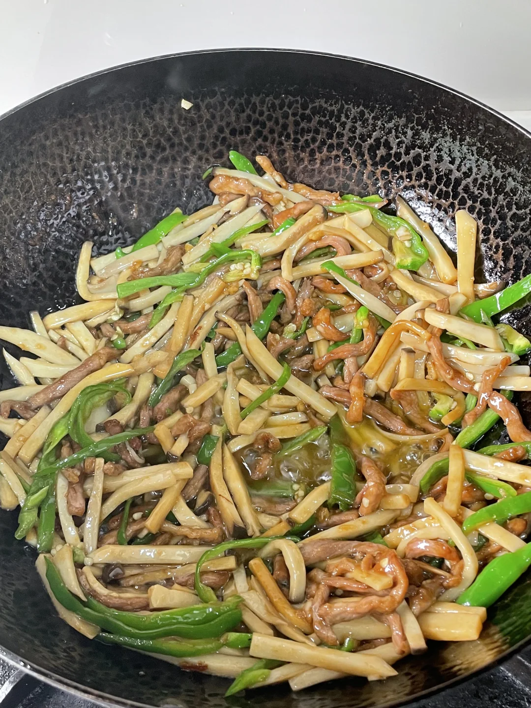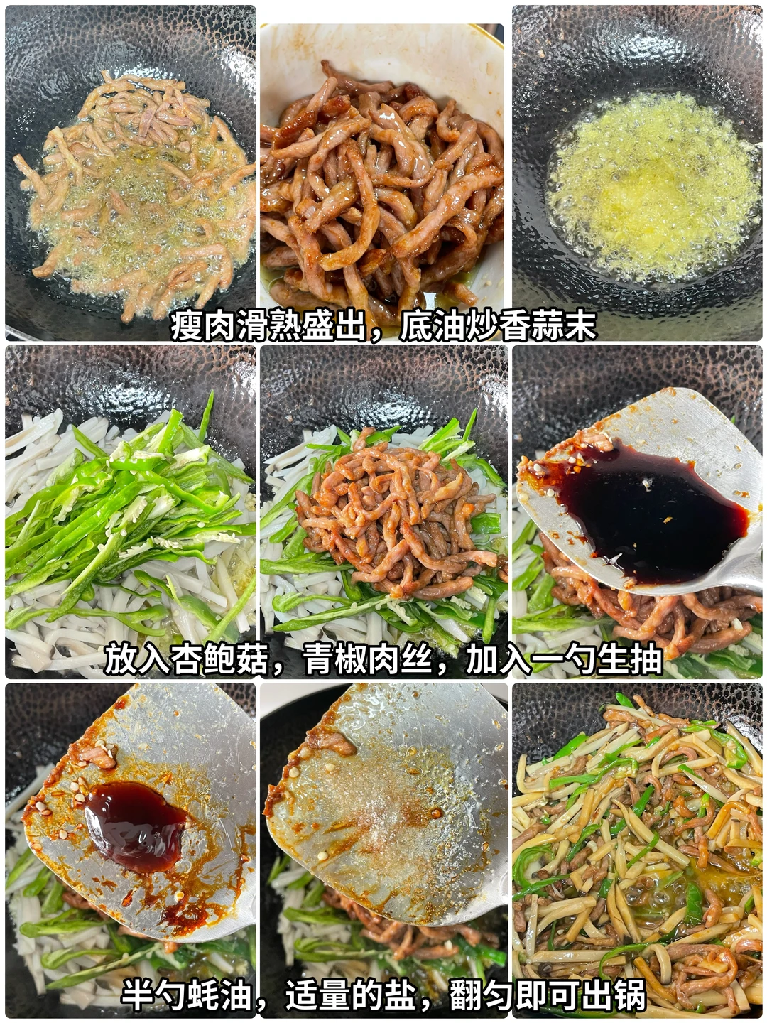 3⃣️起锅烧油,油热将瘦肉滑熟,盛出锅里,底油炒香蒜放入杏鲍菇和青椒丝,再倒入瘦肉加调味,加入1勺生抽,半勺蚝油,适量的盐翻匀即可出锅。这样做出的杏鲍菇肉丝真的巨好吃,喜欢的姐妹试一试吧。