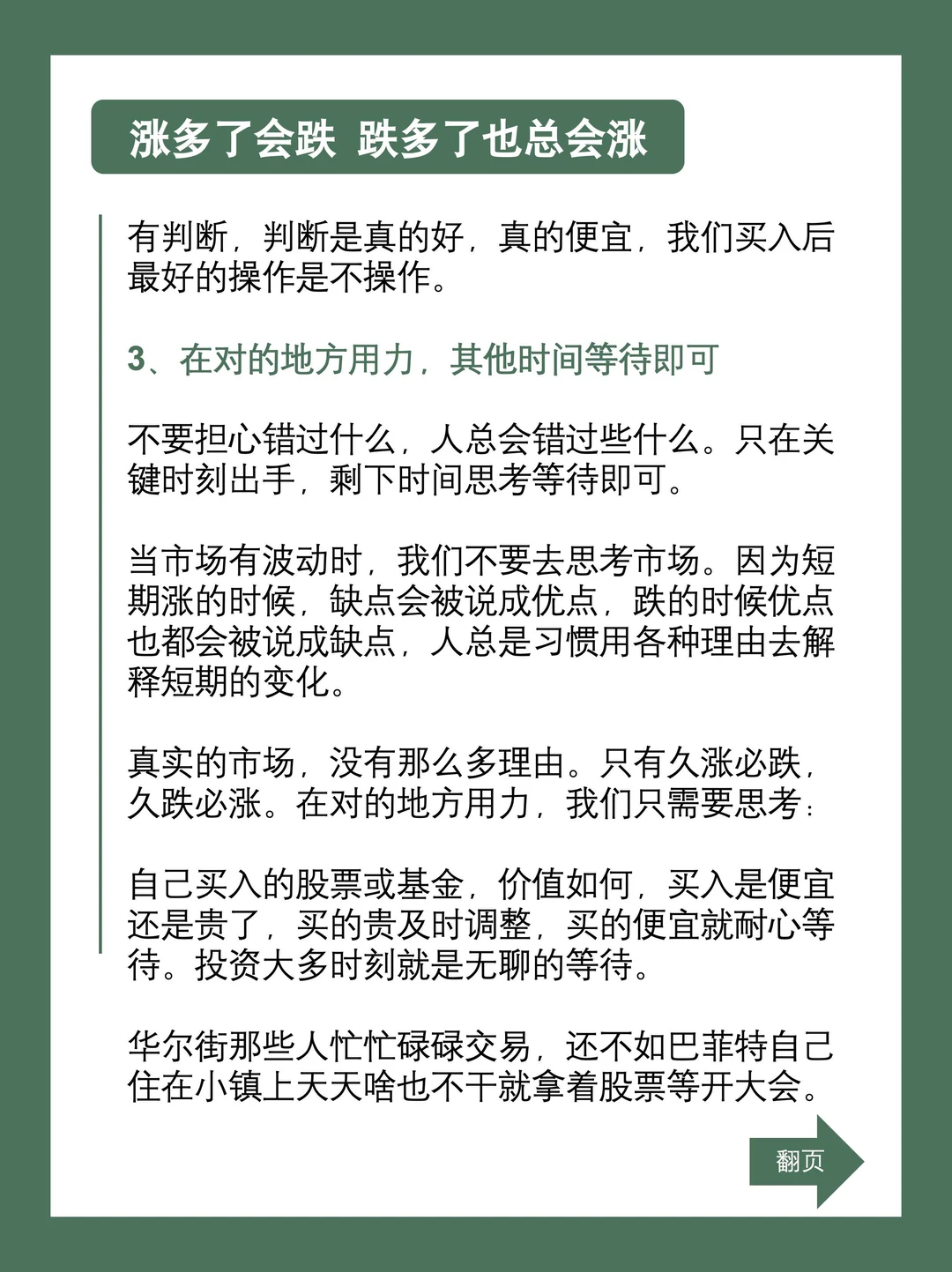 市场真正上涨的时间很少,90%时间是不涨或跌或盘整。没有人能精准预测波动节点,我们也没办法躲开那些不涨或跌或盘整的时间,直接在上涨的时候刚好进来。所以投资一定要买自己有判断、看得懂、有信心、有把握的。把握自己能把握的1,比盲目追寻自己不能把握的10更重要。这一点稍微想一下也能明白,顶尖投资人持仓都是公开的,那些抄作业的人大多数赚不到钱,就是因为他们自己没判断,市场稍有风吹草动根本就拿不住。判断是真的好,真的便宜,我们买入后最好的操作是不操作。