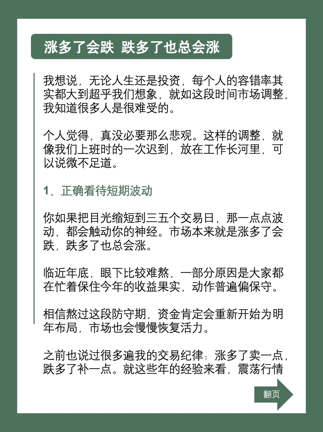 市场本来就是涨多了会跌,跌多了也总会涨。临近年底,眼下比较难熬一部分原因是大家都在忙着保住今年的收益果实,动作普遍偏保守。相信熬过这段防守期,市场也会慢慢恢复活力。震荡行情里最重要的是,当大家都开始恐慌时,你别跟着慌。等大家都觉得又行了的时候,不妨慢慢止盈一些在恐慌中收集的筹码。守好纪律,戒骄戒躁。