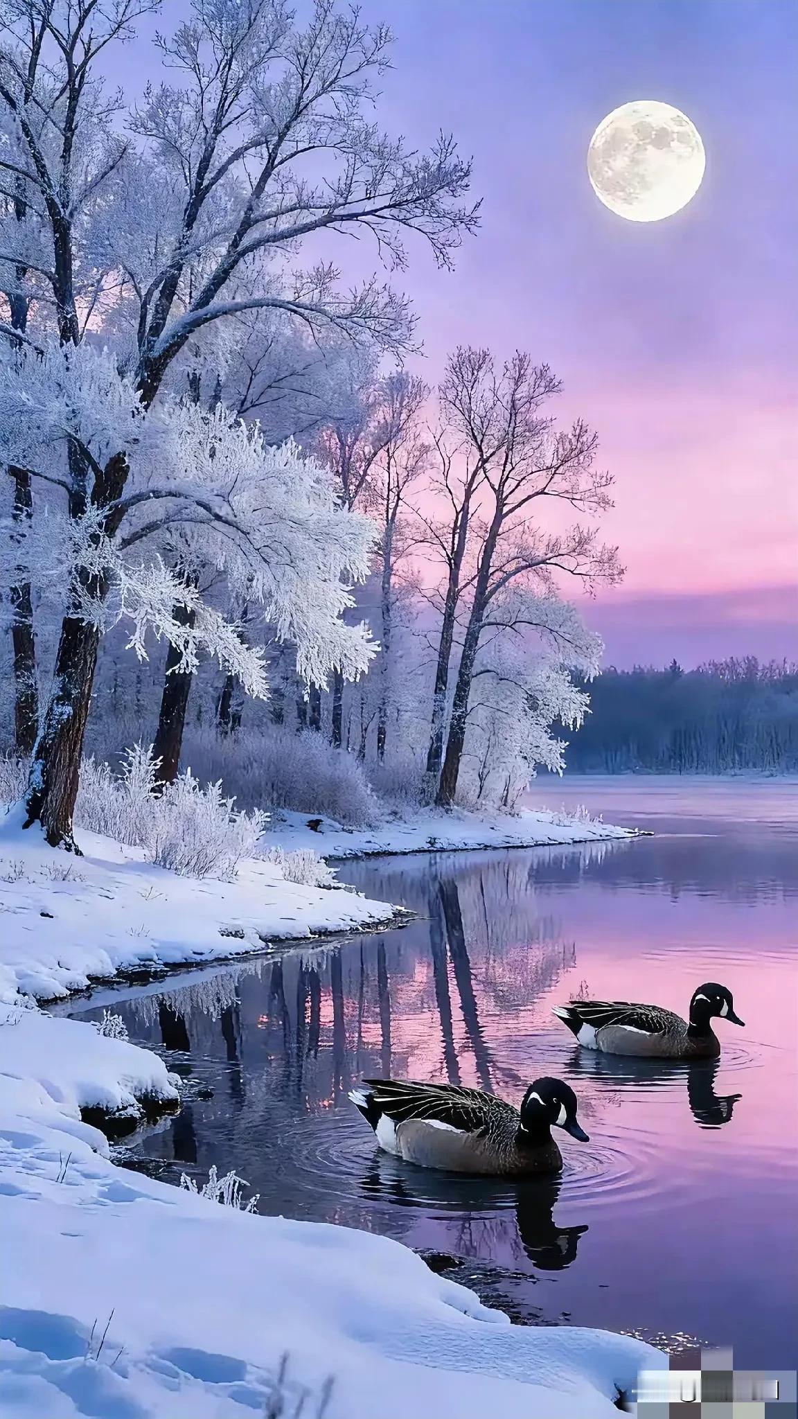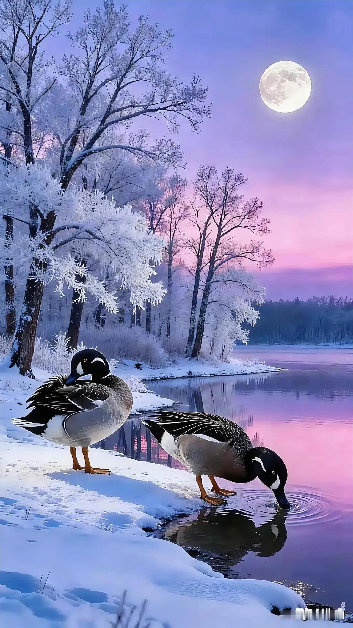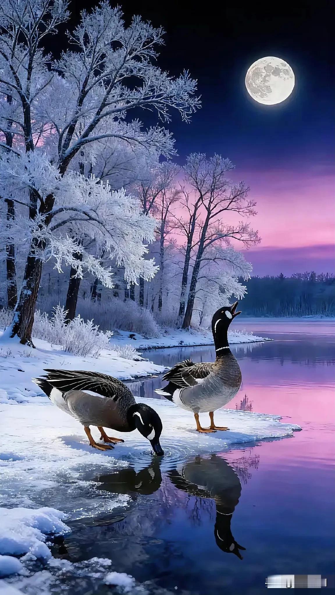 冬夜静谧,月色如水,两只鸭儿戏水,画面如梦如幻。