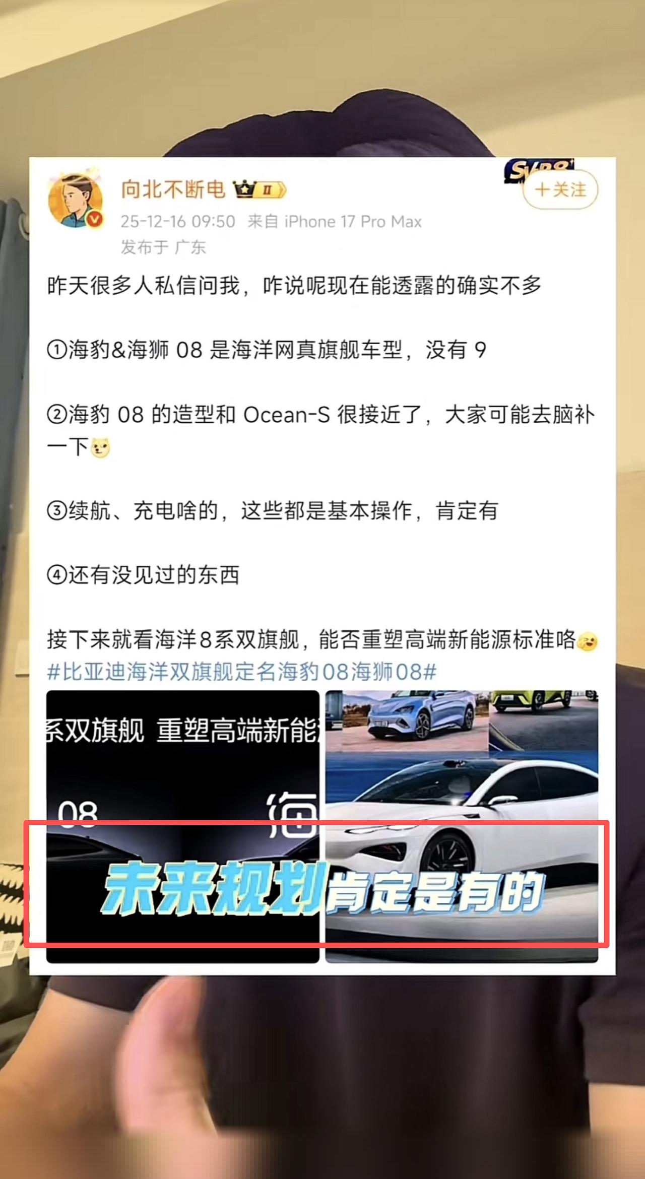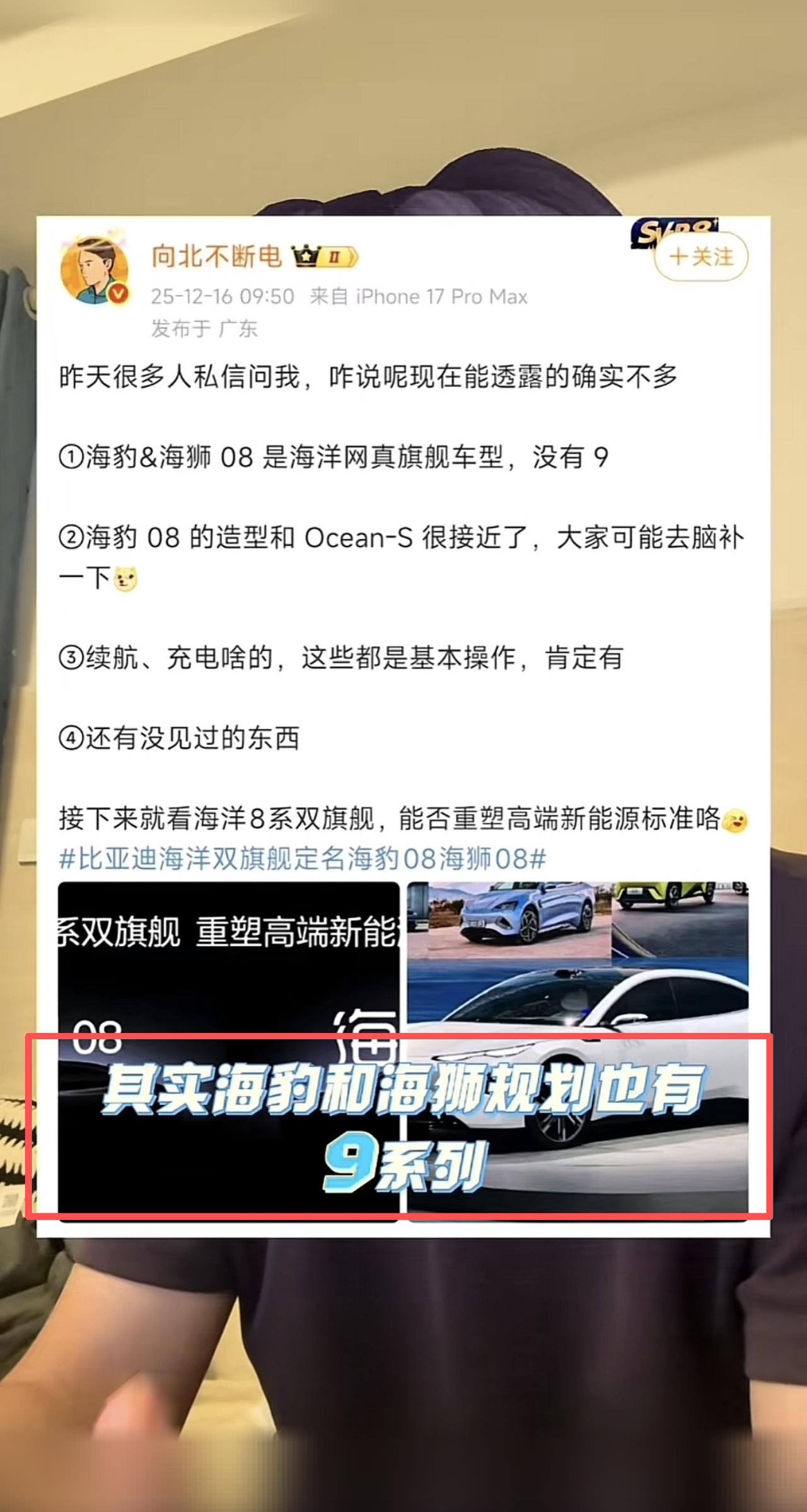 向北说比亚迪海洋网没有9系列,海豹8和海狮8就是海洋网的真旗舰!但我对这个是持怀疑态度的。 为啥这么说?基于两个信息: ①、目前已经确定海豹08是对标比亚迪汉L,而海狮08则是对标唐L; ②、目前已经申报了秦Max,定位是高于秦L的,所以后面还有大汉(汉Max)和大唐(唐Max)。 那么问题来了?按照王朝网和海洋网产品规划,基本上是同一平台两种外观两个车型,所以海洋网自然要有能够对标大汉和大唐的产品,你不出09系列那肯定说不过去。 比亚迪汉L和唐L是在今年4月9日上市的,而海狮08和海豹08大概率也是在2026年的一季度,推迟了10个月左右,差不多是小一年的时间(海豹08和海狮08是对标小改款的汉L和唐L)。 所以按照这个节奏,那么大汉和大唐发布后,海洋网差不多也要在10个月甚至一年后才有对标的产品出现。目前大汉和大唐还没有申报,现在也不知道是在明年什么时候发布,所以短期来看,比亚迪内部应该是没有这个计划(大概率是2026年没有这个计划,得等到2027年去了),或者说这个计划还处于评估阶段,还没有定型,但是后续一定会上的。 我们看看:海豹05对标秦PLUS、海豹05对标秦L,海豹07对标汉、海豹08对标汉L,那不是就是海豹09对标汉Max(大汉)?海狮这边也差不多,海狮05、06对标的就是宋Pro、宋L,海狮07就是对标唐,那海狮08就是对标唐L,那是不是海狮09对标唐Max? 另外向北也叠了个甲,说目前不能透露的太多。所以我还是赞成这位【王探长】的说法,后续一定是有的,但是没这么快。