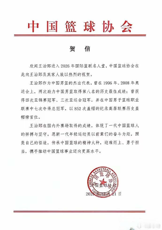 王治郅入选国际篮联篮球名人堂王治郅凭什么能入选国际篮联的名人堂呢?在国际赛场上,王治郅帮助中国拿到了2次亚锦赛冠军、3次亚运会冠军,为中国男篮参加过4届奥运会和2届世锦赛。2010年广州亚运会,33岁的他在决赛砍20分带队夺冠,队友们把12块金牌全挂在他脖子上的画面,至今还是中国篮球的经典一幕。在俱乐部,王治郅带领八一队在CBA豪取6连冠,是中国首位登录NBA的球员,也是姚明心中的偶像和大山,更让中国移动长城名传世界,因此王治郅入选名人堂可以说实至名归了,对中国篮球的贡献无与伦比。热点观点