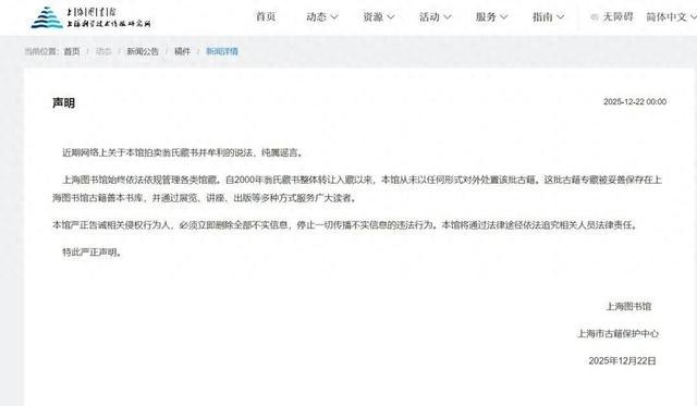上海图书馆始终依法依规管理各类馆藏。自2000年翁氏藏书整体转让入藏以来,本馆从未以任何形式对外处置该批古籍。这批古籍专藏被妥善保存在上海图书馆古籍善本书库,并通过展览、讲座、出版等多种方式服务广大读者。