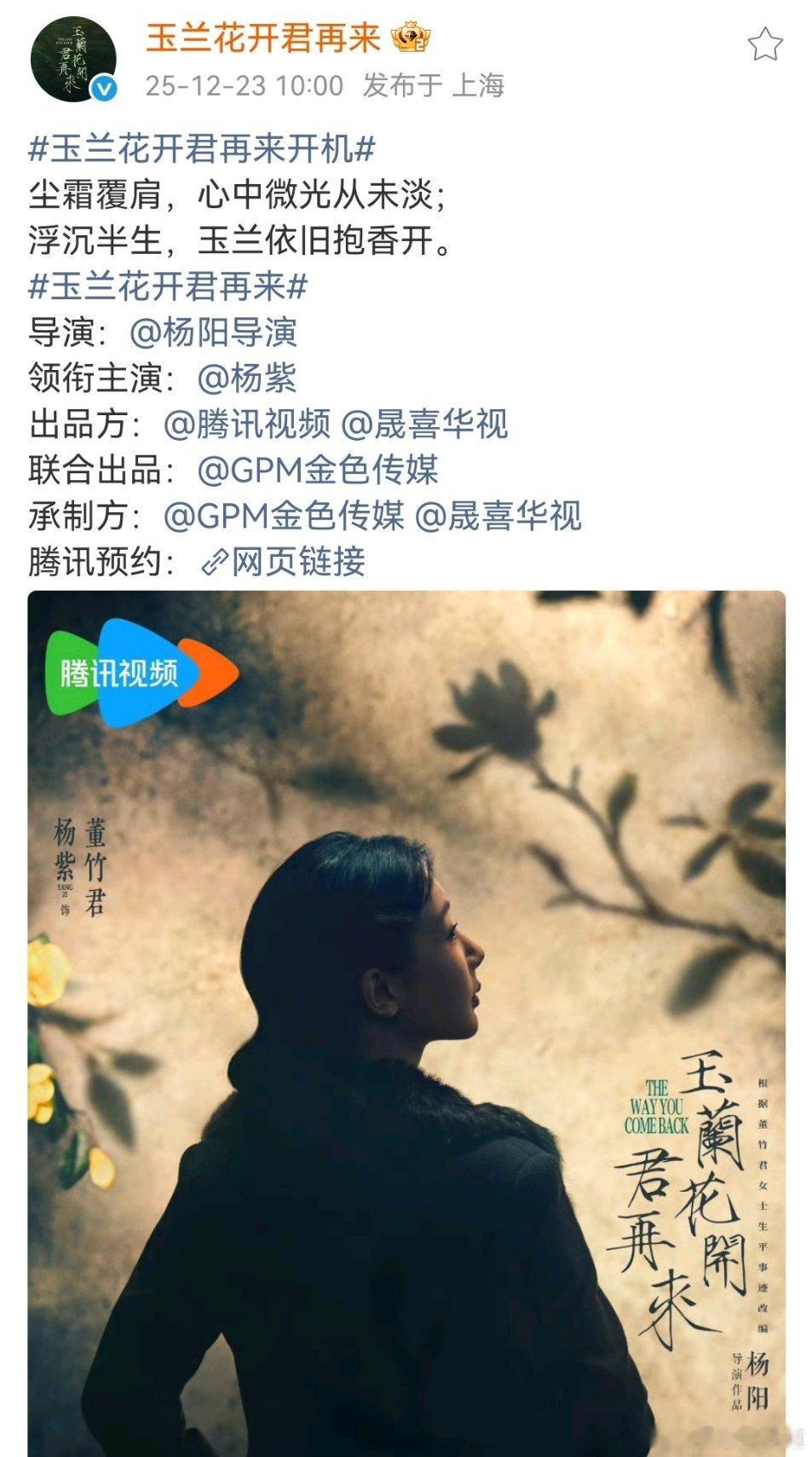玉兰花开君再来开机玉兰花开君再来开机官宣,杨紫单人海报单宣,绝对的大女主,看妆造
