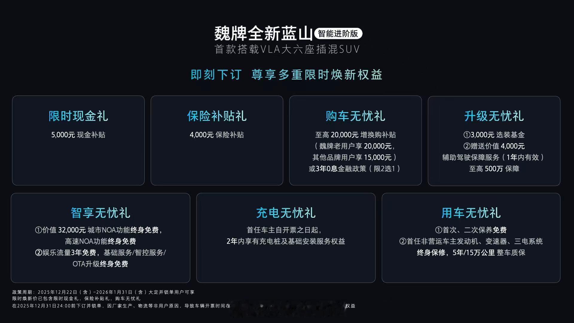 魏牌蓝山智能进阶版上市,限时优惠27.58w起。新车定位大六座SUV,尺寸5156mm x 1980mm x 1805mm,轴距3050mm,共推出3款车型,外观与25款车型保持一致,车内采用四屏联动设计,并配备后排吸顶屏。动力方面搭载智能电混四驱Hi4技术,由1.5T发动机与前后双电机组成,馈电油耗6.5L/100km,而根据配置不同,CLTC纯电续航最高可达263km,综合续航可达1343km。蓝山智能进阶版拥有激光雷达在内多达27个感知硬件,在配合VLA大模型和算力达700 TOPS的Thor-U芯片加持下,新一代CP Master辅助系统将支持雨雾/夜间复杂环境识别,CoT卡片更会实时显示决策逻辑等。大家觉得这款新蓝山的价格够诚意嘛?魏牌蓝山