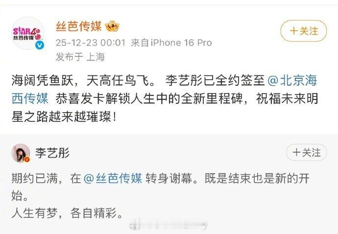 李艺彤和丝芭合约到期,丝芭已转发李艺彤官宣离开丝芭