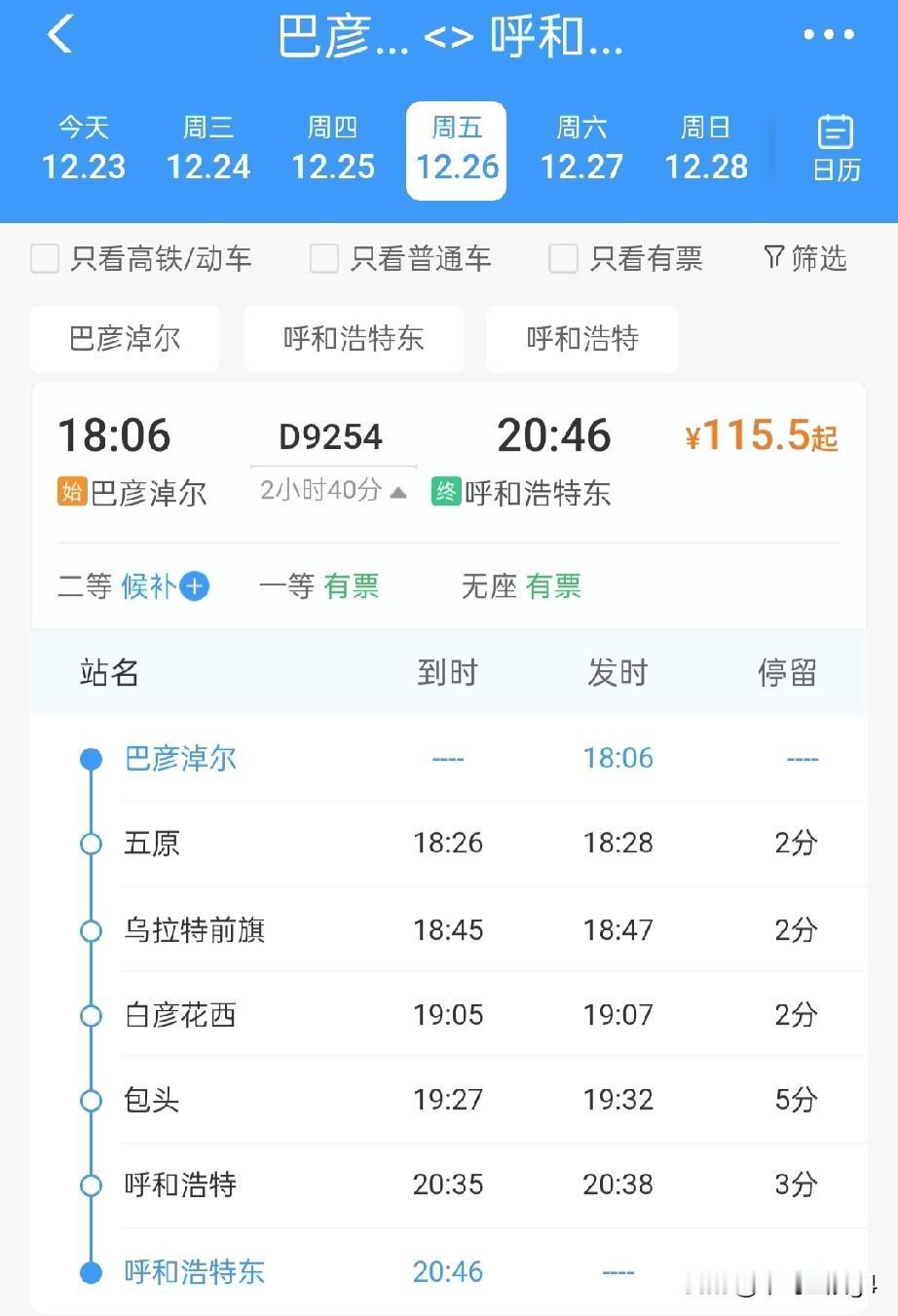 巴彦淖尔站有两趟始发列车,一趟跨省开往深圳 另一趟是开往首府呼和浩特的高铁 巴彦淖尔站,2024年7月开通运营,服务,内蒙古巴彦淖尔市临河区以及周边城市的旅客出行,2025年12月包银高铁开通,这座车站成为了包兰铁路,临哈铁路以及包银高铁三条线路的枢纽车站,巴彦淖尔成为了一个交通更加完善的枢纽城市。 巴彦淖尔站在之前有一趟始发跨区列车,Z184次列车,途经包头、呼和浩特等城市,并途经京九铁路开往深圳方向,全程需要38个小时,也是两地间唯一一趟旅客列车。 巴彦淖尔站12月24日起新开通一趟高铁列车,经由包银高铁和呼包快铁,最高时速250公里,D9254次列车,到达呼和浩特仅需要两个半小时,到达包头也仅需一个半小时,旅程也进一步缩短,同时途经巴彦淖尔站的至呼和浩特方向、乌海、银川方向的动车组列车也在23日起开通,而2026年1月还将开通更多方向的高铁列车,列车到达范围进一步增加,时间也是进一步缩短。