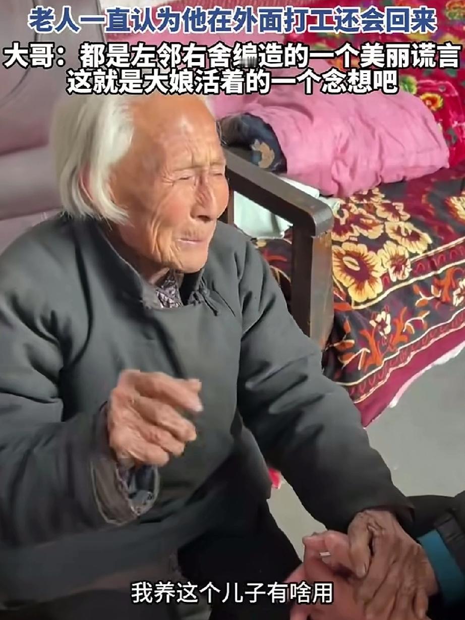90岁大娘,儿子去世十几年了,大娘一直以为儿子在外打工还会回来,左邻右舍为大娘编织了一个美丽的谎言,也许这是大娘最后的念想吧! 大娘时不时就抱怨儿子多年不回家,可她哪知道儿子早已不在了,十几年的时间,大娘见不到儿子,她的思念早已化成漫长的等待,幻想着儿子有一天突然出现在她面前,可这一幕永远等不来了!谁也别说串这个“骗局”就让这个美丽的谎言陪着大娘度过余生吧!