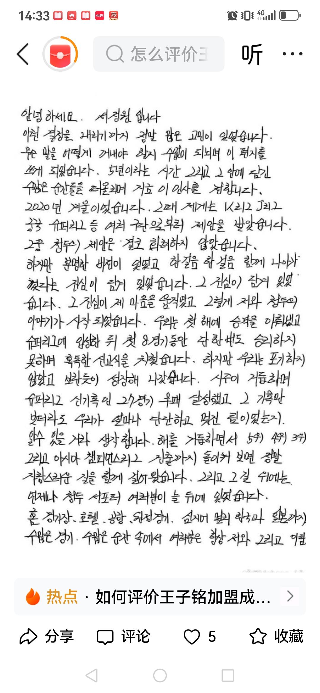 据说这(附后)是12月18日徐正源的手书的告别信,懂韩文的友友请翻译一下。 其实,别看老徐带球队很细腻、在赛场显本事、对球迷有深情,但不太善言辞,不知他下定决心的第一时间最想说的什么? 当然,不管他怎么说,成都球迷心中都自有感觉,都是谢意和祝福![祈祷]