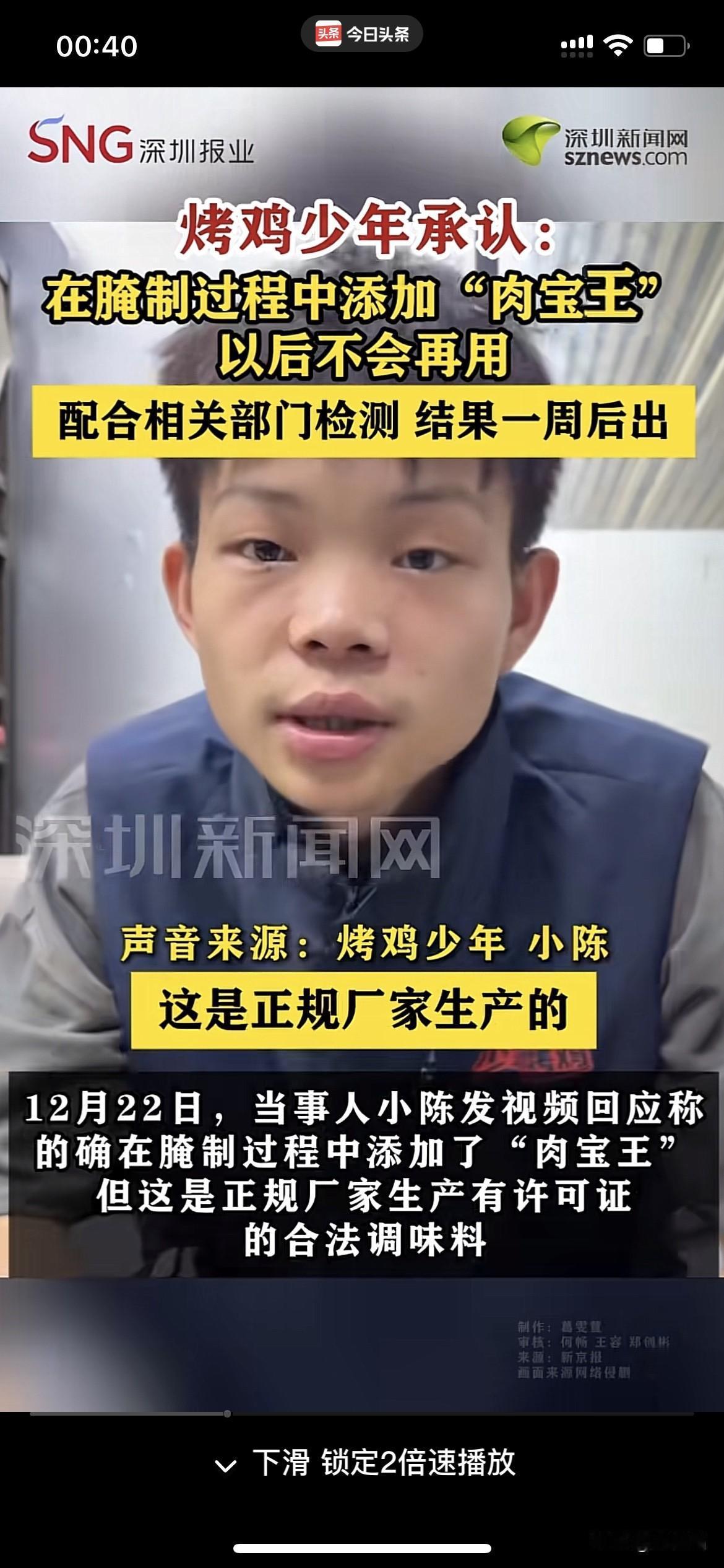 果然还是翻车了!深圳,16岁烧鸡少年日销百鸡爆火,被举报使用“肉宝王”,本人回应:已送检,不再使用争议调料。 人红是非多,烤鸡少年没爆火几天,就被举报,小陈也敢做敢当,主动承认确实使用了肉宝王腌制生鸡,调料是正规厂家合规生产的,因为不懂而使用,目前改用黄姜去腥,不再使用存在争议的调味料。他直言理解大家对食品安全的担忧,表示食品安全第一。 这次的食品安全风波,也给了烧鸡少年一个提醒,树大招风,做人要低调,全网宣传自己一个月赚几十万,肯定会招人眼红。 同时最为重要的是,做生意不能昧良心,食品安全永远是第一位,利用所谓的科技狠活来达到食品增色增香的套路,一抓一个准,别拿顾客的信任当儿戏。消费者愿意为美味买单,是基于对食材健康、安全的信任,一旦这种信任被打破,那生意也就做到头了。 对于小陈来说,这次风波既是危机也是转机。送检结果如果没问题,那能让消费者重新建立起信心;但要是结果不理想,那他就必须为自己的错误付出代价。 不过从他主动承认并表示不再使用争议调料来看,还是有一定担当的。希望这位有迈巴赫梦想的少年坚守食品安全底线,为梦加油吧。