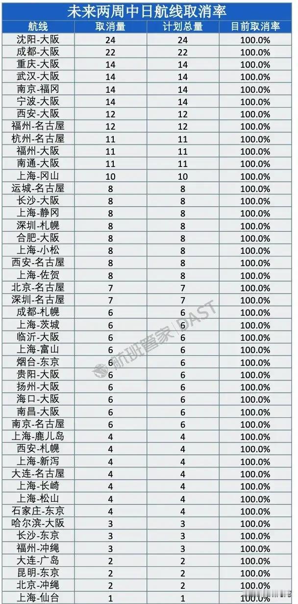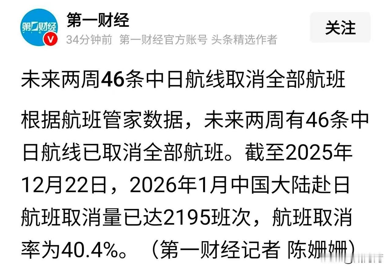 突发消息:未来两周46条中日航线取消全部航班! 显然,这是因为高市早苗挑起来的后果。现在,中国人都不去日本旅游观光了,中国飞往日本的航班每天都在巨亏,所以取消中国飞往日本的航班是理所当然的。未来随着中国人都抵制去日本,相信所有中国飞往日本的航班都得取消,直至零航班飞往日本。 这是高市早苗挑衅给日本带来的恶果,这是与14亿中国人为敌的惩戒。如果高市早苗还不及时低头认错,对小日本的制裁还会继续加码!