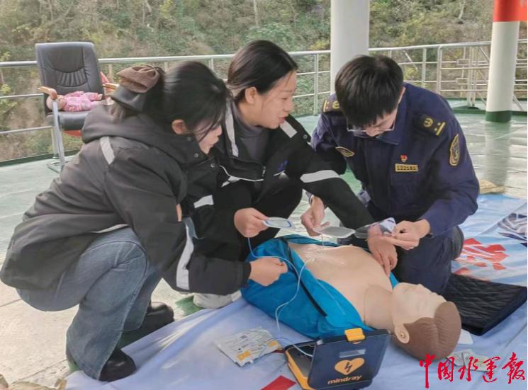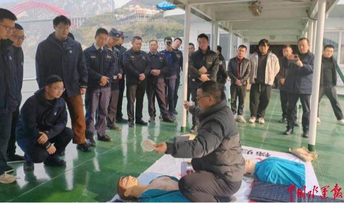 装配当天,宜昌归州海事处联合郭家坝卫生院在航道码头趸船,组织了水上医疗急救专项培训,现场还邀请了秭归县卫健局专业人员进行现场授课,系统讲解除颤仪操作规范、心肺复苏核心流程、海姆立克急救法,以及水上急救注意事项等内容。