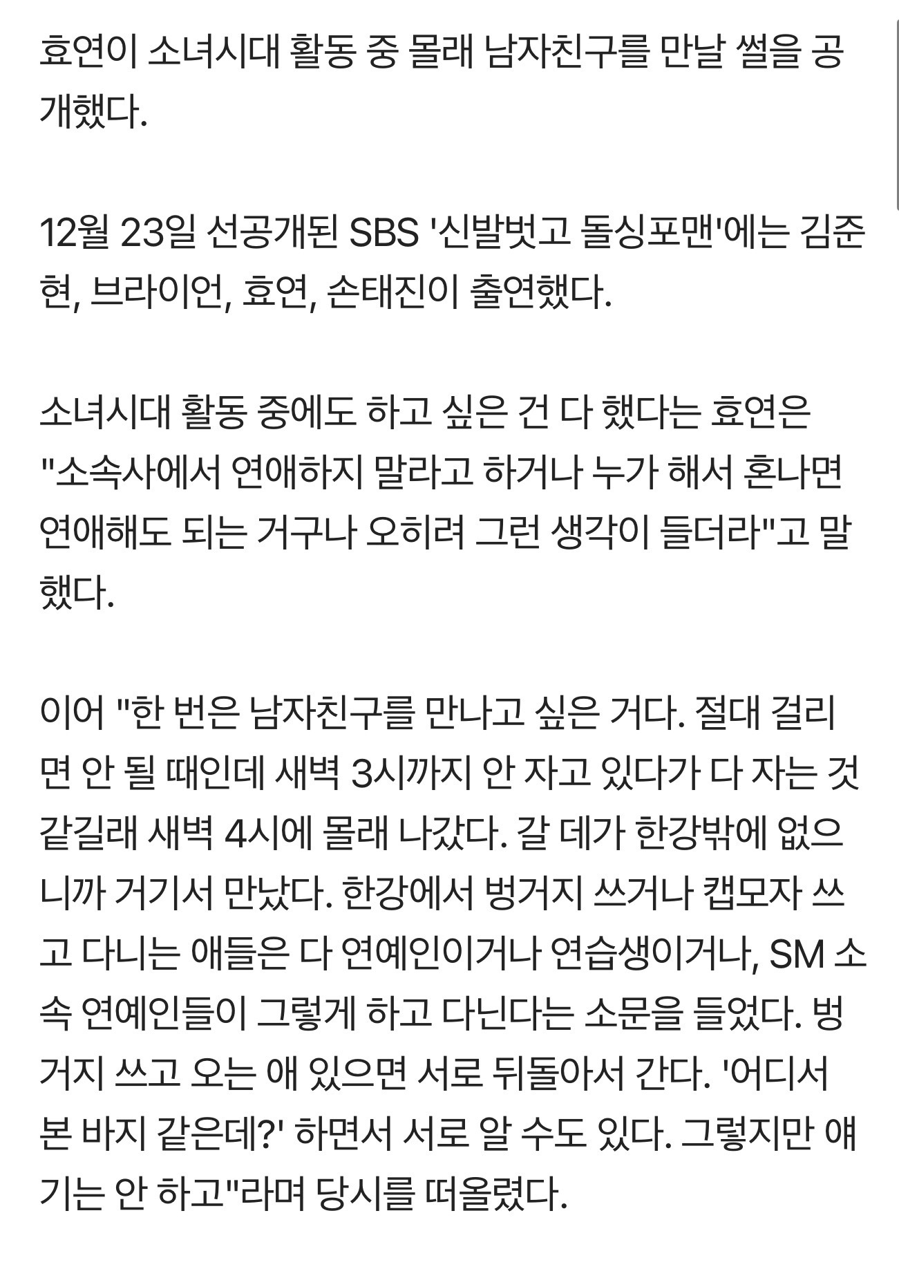金孝渊自述少女时代活动期偷偷和男朋友约会 金孝渊在节目里讲了自己在少女时代活动时期偷偷和男朋友约会的故事。“有一次特别想见男朋友。当时是绝对不能被发现的时期,我一直到凌晨3点没睡,大家都睡着了,所以凌晨4点就偷偷溜了出去。”“能去的地方只有汉江,所以就在那里见面了。听说在汉江戴着渔夫帽或鸭舌帽的,都是艺人或是练习生,甚至是SM公司的艺人。如果有同样戴着渔夫帽过来的人,大家就转身就走。好像在哪里见过这样的裤子?可能互相认识,但是不会说。”