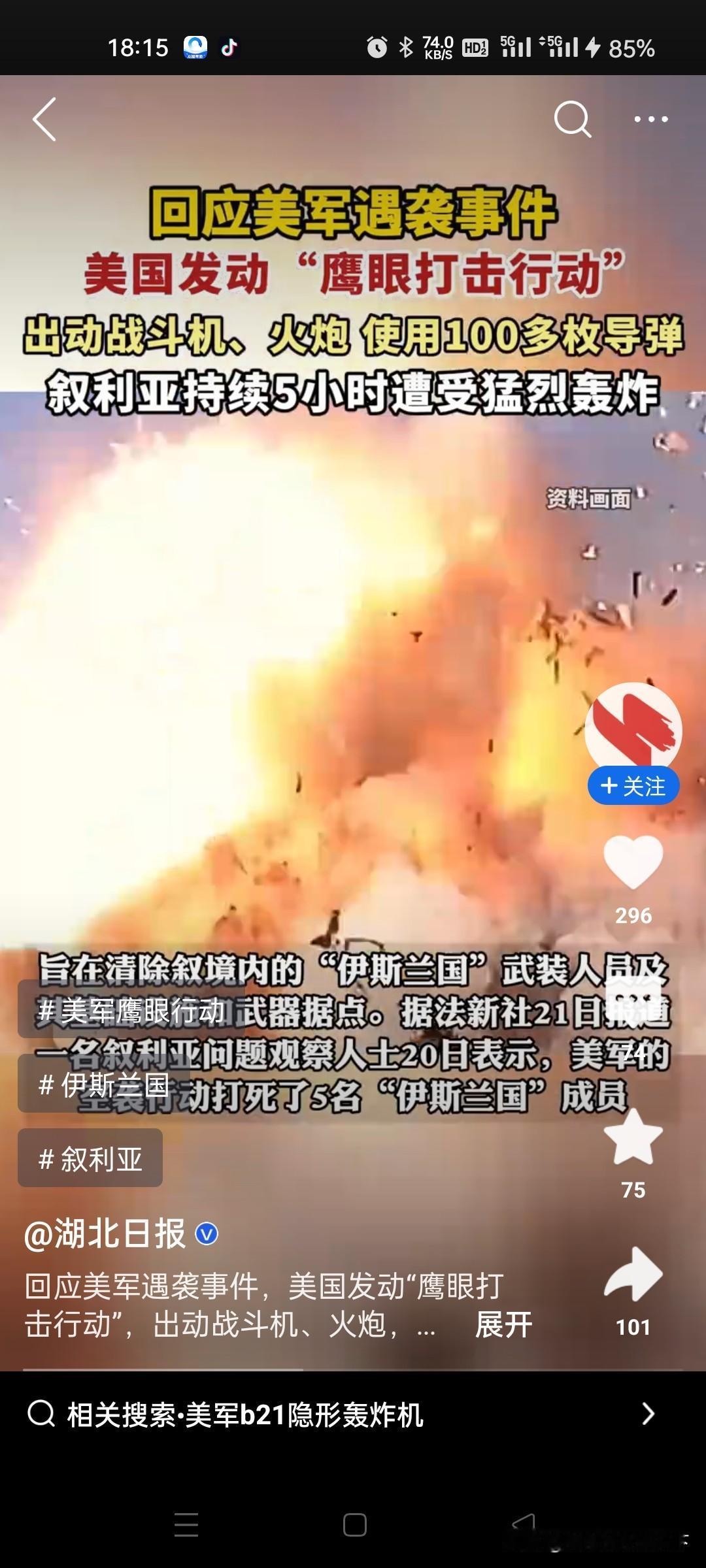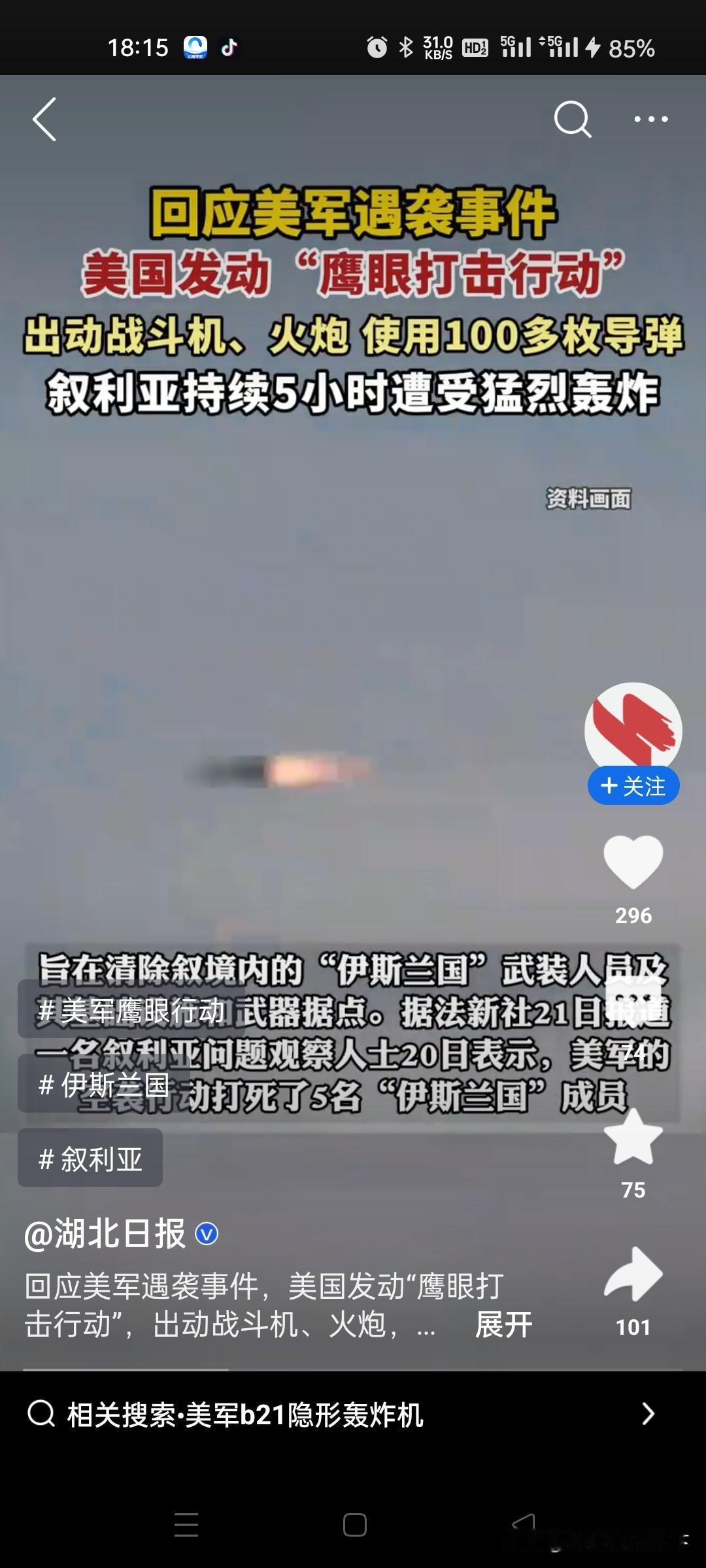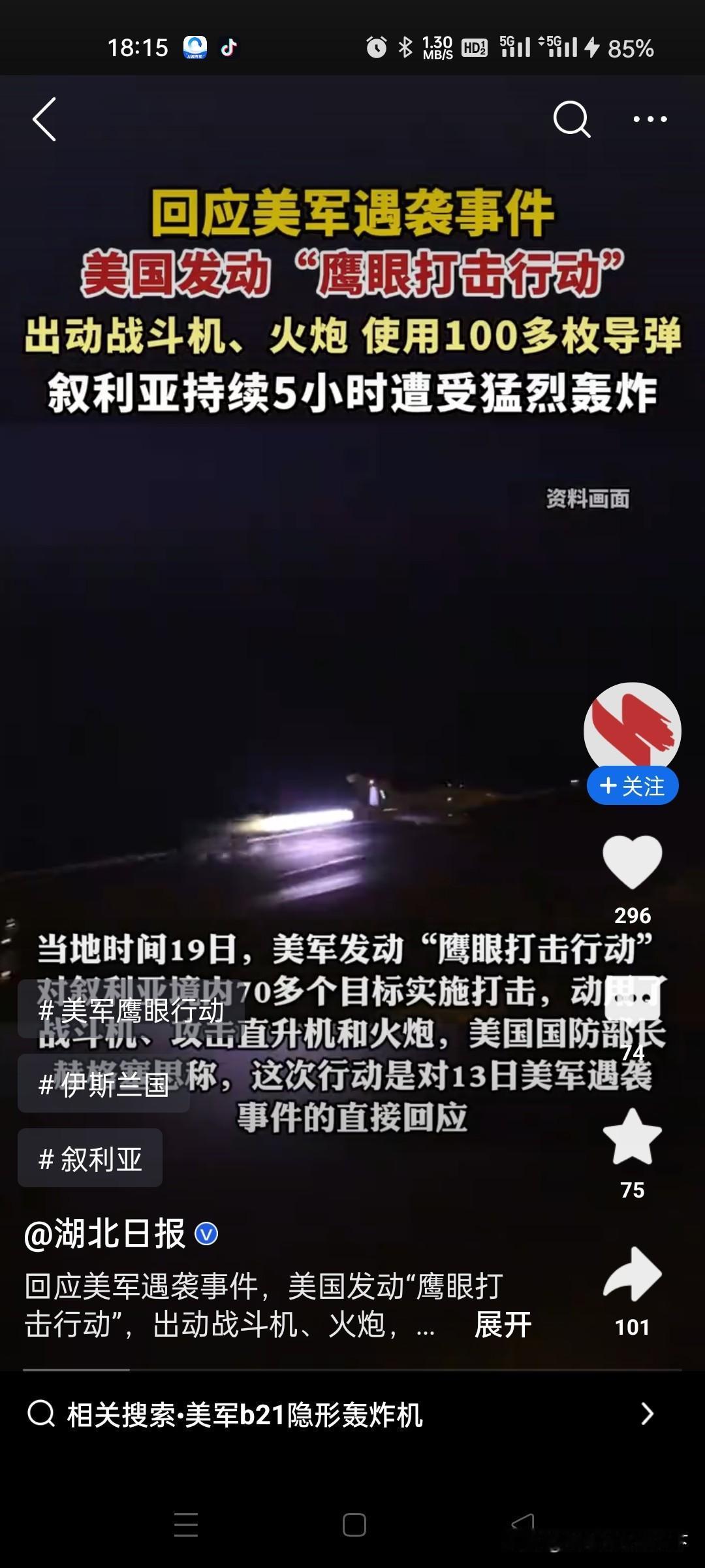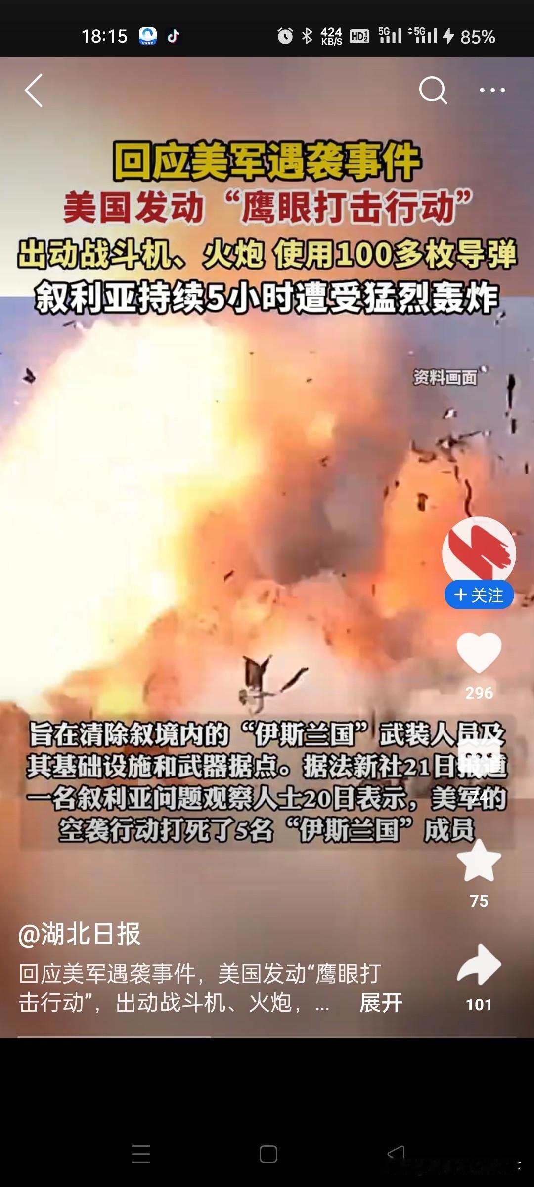 突发!美军出动飞机袭击叙利亚!发射100多枚导弹,袭击70多处目标,持续5小时。美军发动鹰眼打击行动,袭击叙利亚。当地时间12月19日,美军发动“鹰眼打击行动”,对叙利亚境内70多个目标实施打击,以回应12月13日的美军遇袭事件 。具体情况如下: - 遇袭事件经过:12月13日,美军与叙利亚过渡政府安全部队在叙利亚中部霍姆斯省巴尔米拉市附近联合巡逻时遭枪击,造成2名美军士兵和1名美国平民翻译死亡,3名美军士兵受伤。美方称袭击者为极端组织“伊斯兰国”成员,且该袭击者已被击毙。 - “鹰眼打击行动”详情 :美军中央司令部称,行动于美国东部时间19日16时开始,美军动用战斗机、攻击直升机和火炮,对叙利亚中部的“伊斯兰国”目标发动打击。约旦皇家空军也参与了此次行动。此次行动共使用100多枚精确制导弹药,打击了“伊斯兰国”的基础设施和武装据点等目标,持续约5个小时。 - 各方反应 :美国总统特朗普称这是“对帕尔米拉袭击事件的恐怖分子实施我承诺过的、非常严厉的报复”。叙利亚过渡政府外交部表示,叙利亚致力于打击“伊斯兰国”,并呼吁美国及国际联盟成员国支持叙利亚打击恐怖主义,未将美军此次空袭视为新的战争开始,而是强调反恐共同责任。
