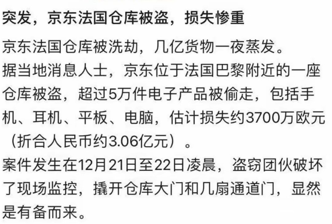 京东巴黎仓被盗又有猛料!仓库已恢复运营,之前传的5万台3C设备、3个多亿损失和