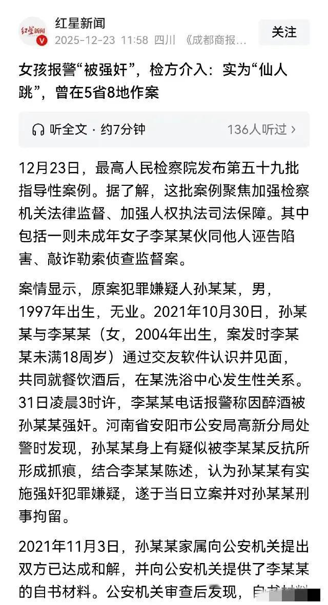 河南安阳,男子和不满18岁女网友奔现,二人吃完饭后在洗浴中心发生了关系,第二天凌晨3点,女孩报警称醉酒后被男子强奸。民警迅速赶到将男子拘留,几天后男子家属称和女孩和解,但民警却从中嗅出不一样的味道,经过调查,男子被无罪释放,女孩却被判刑了。 据红星新闻报道,2021年案发时,孙某某只有24岁。当时孙某某没有工作,是个无业游民,闲来无事,孙某某经常在网上和女孩聊天。 2021年10月30日,孙某某认识了一个17岁的女孩李某某,孙某某约李某某见面,李某某同意了。 24岁无业男网友奔现17岁女孩,喝酒洗浴后发生关系,凌晨女孩报警称被强奸,男子身上的抓痕让他直接被刑拘。 可没几天家属说已和解,女孩突然翻供称是报假案,民警一眼看出破绽。监控里两人手挽手亲密同行,所谓“姑姑姑父”不仅身份造假,还向家属索要3万“撤案费”。 原来这是三人流窜5省的惯犯套路,8起诬告敲诈23.7万,以为能靠假报警拿捏别人,却不知司法不会被谎言蒙蔽。 法律从不是敲诈勒索的工具,任何试图钻空子践踏规则的人,终将被规则严惩。 未成年人强奸案 未成年女生性侵