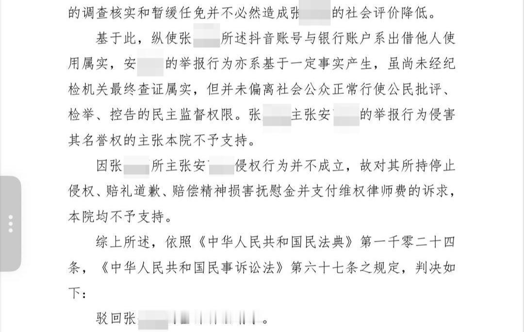 国企女职工账号打赏男主播600余万,纪委调查后澄清,法院却认定举报有据:到底谁在说谎? 一名国企员工张某某被人举报,称其在抖音直播间频繁给某男主播打赏,累计花费超过600万元,举报人安先生为一名商人,他表示自己注意到名为xx阳光的账号,长期向男主播xx超市进行高额打赏,认为一名国企职员有这样消费行为颇为异常,遂向纪委监委寄送了举报信,张某某所在单位随后展开调查,回应称她与该男主播并无私交,相关指控属于恶意中伤,目前,此事已进入司法程序。 事情的起因,是安先生发现张某某的抖音账号自2023年起频繁向男主播打赏,两年间仅打赏礼物就花费了相当一笔钱,而该账号是以张某某本人实名注册的手机号开通的,安先生怀疑资金来源存在问题,便将相关材料寄送至纪检部门,随后,张某某所在公司的纪委介入调查,核实后回应称,张某某表示自己从未与男主播有过联系,也未曾赠送过任何奢侈品。 案子到了法院,张某某起诉安先生侵犯名誉权,要求赔礼道歉并索赔20万。开庭时男方主播王某强和直播间工作人员钱某琴出庭作证。钱某琴说这个账号其实是她借表妹张某某的手机号注册的,所有打赏和转账都是她自己操作的,并且她和王某强是合作伙伴,一起开过公司。 法院审理的时候发现,虽然账号登记在张某某名下,可是上面发布的全都是,她自己的照片视频,而且她的银行账户,确实和对方有大额的往来,安先生举报说他们俩关系不寻常,虽然还没有查清楚,但是法院觉得他的举报有初步的根据,关键的地方,是安先生是在官方渠道举报,不是到处乱说,另外纪检部门的调查,本身不影响张某某的社会评价。 判决书显示安先生的行为属于正当监督,不构成侵权,张某某所主张的赔偿以及道歉都没有得到支持,这个案件花费,的4300元还得自己支付,对于账号的实际使用者钱某琴,法院没有再进行追究,不过整个过程暴露出实名认证和账号借用人之间存在漏洞。 张某某工作单位的纪委之后也出面进行了澄清,不过安先生的内容,毕竟引发了这样多的争议,其中涉及的钱款流向,到现在还没有公开作出解释,直播打赏这样的网上消费形式,有时候确实很容易让人搞不清楚钱到底花在了什么地方。 对于此事你有什么看法,评论留言!正义会迟到,但不会缺席,点赞,让更多人看到!