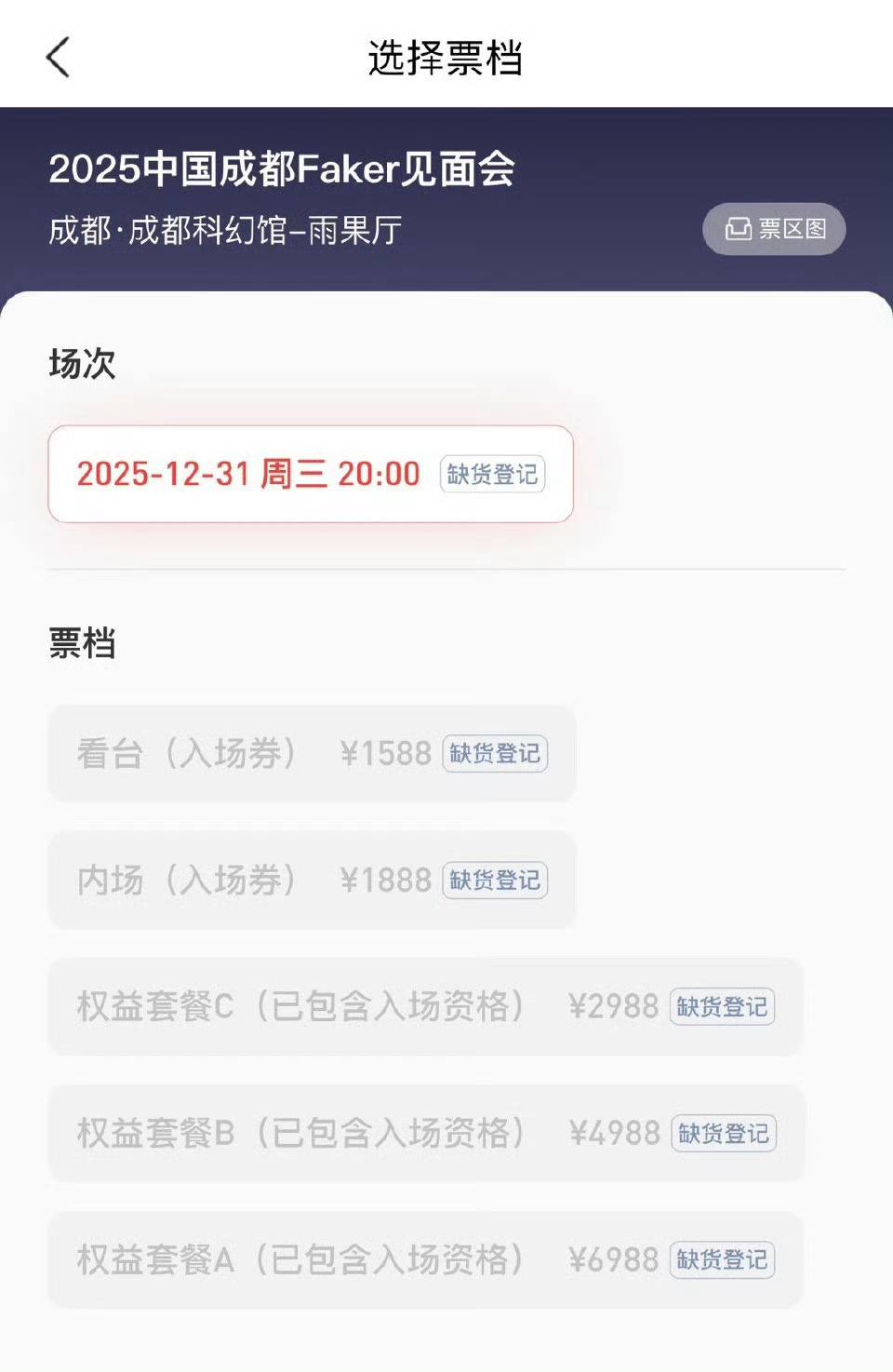 Faker12月31日成都见面会,票价为1588-6988,图2已经售罄了!!