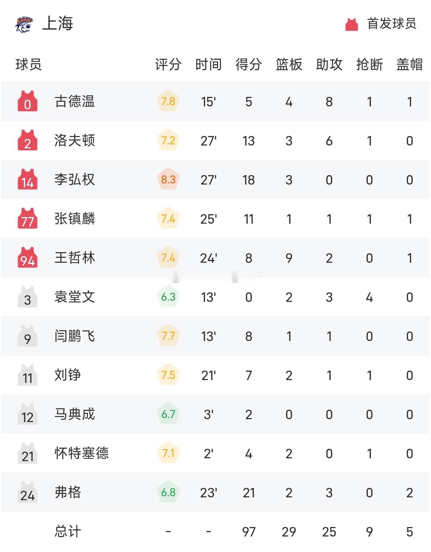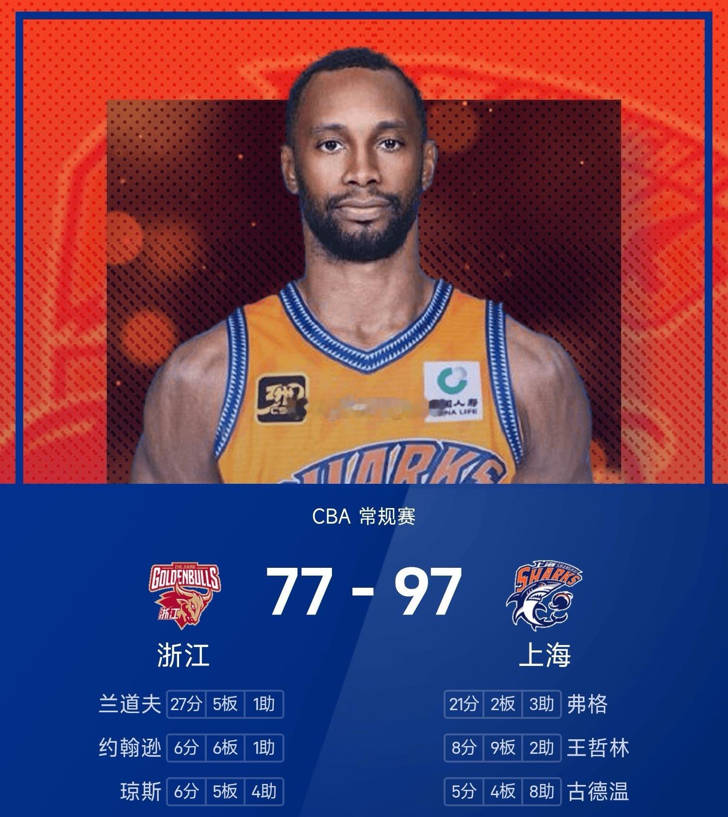 CBA12月23日讯 25/26赛季CBA 常规赛,上海对阵浙江。双方全场战罢,上海97-75战胜浙江。弗格得到21分2板3助率队取胜,兰道夫空砍全场最高的27分5板1助。