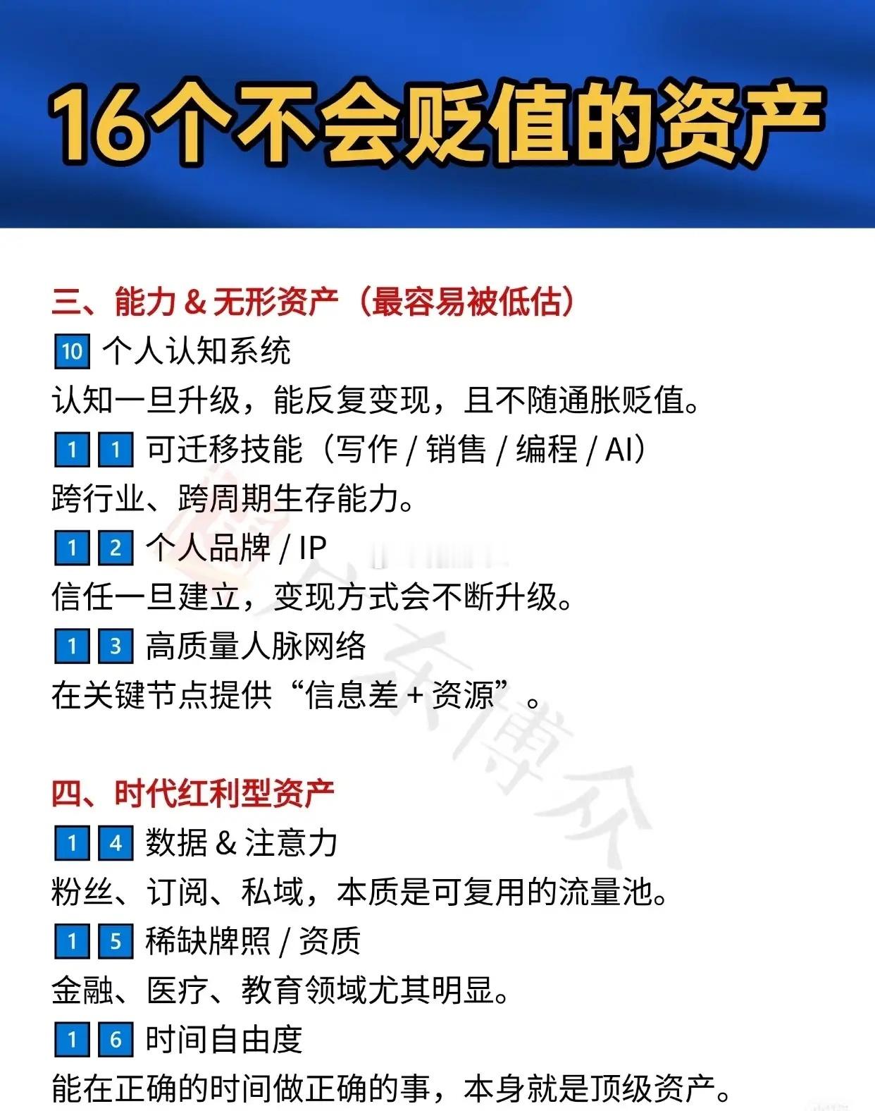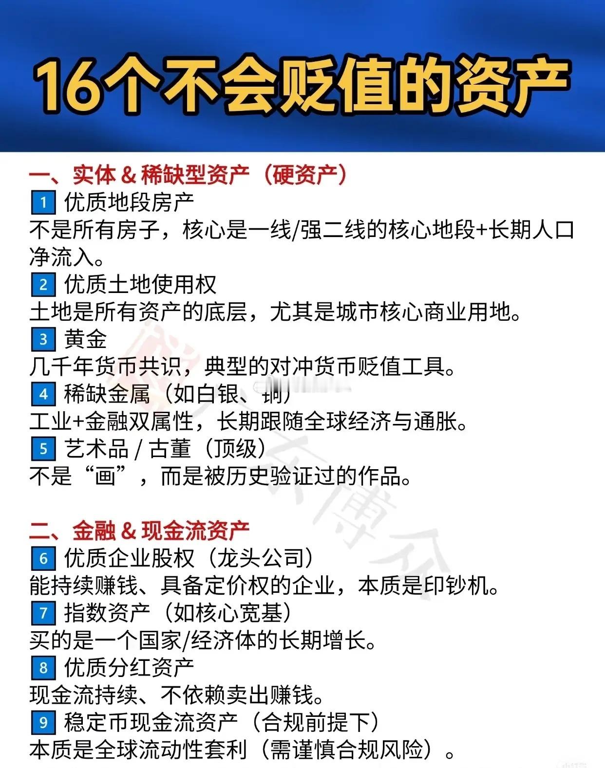 “16个不会贬值的资产”可分为四大类,涵盖实体稀缺型、金融现金流、能力无形资产及时代红利型资产:一、实体&稀缺型资产(硬资产):包括核心为一/强二线核心地段且长期人口净流入的优质地段房产;作为资产底层的优质土地使用权(尤指城市核心商业用地);拥有几千年货币共识、可对冲货币贬值的黄金;兼具工业与金融属性、跟随全球经济及通胀的稀缺金属(如白银、铜);以及被历史验证过的顶级艺术品/古董(非普通画作)。二、金融&现金流资产:有能持续盈利、具备定价权的优质企业股权(龙头公司,本质是“印钞机”);代表国家/经济体长期增长的核心宽基指数资产;现金流持续、无需出售即可获利的优质分红资产;以及在合规前提下涉及全球流动性套利的稳定币现金流资产(需注意合规风险)。三、能力&无形资产(最易被低估):能反复变现且不随通胀贬值的个人认知系统(认知升级后价值提升);跨行业、跨周期的可迁移技能(如写作、销售、编程、AI);信任建立后可不断升级变现方式的个人品牌/IP;在关键节点能提供“信息差+资源”的高质量人脉网络。四、时代红利型资产:包含可复用流量池性质的数据&注意力(如粉丝、订阅、私域);金融、医疗、教育等领域尤为突出的稀缺牌照/资质;以及能在正确时间做正确事的顶级资产——时间自由度。