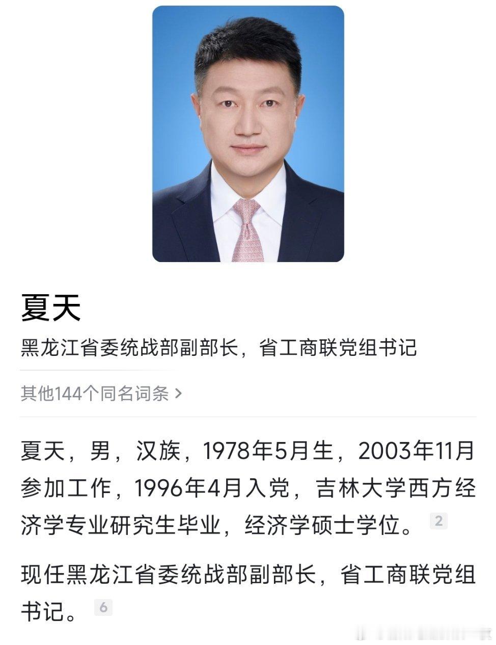 夏天已任黑龙江省委统战部副部长、省工商联党组书记。